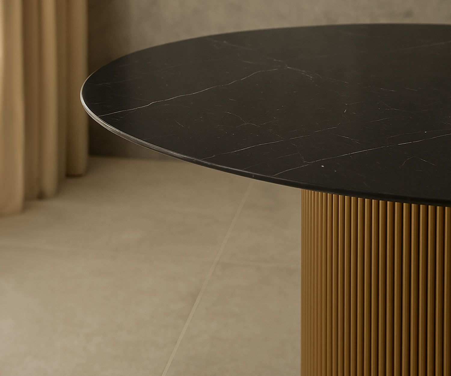 Seine markante Optik wird durch große, architektonisch gestaltete Metallbeine im Rilldesign geprägt, die dem Tisch eine starke Präsenz verleihen und gleichzeitig viel Beinfreiheit bieten. Die runde Tischplatte – wahlweise aus edlem Keramikmaterial oder feinem Echtholzfurnier – verbindet stilvolle Ästhetik mit langlebiger Qualität.