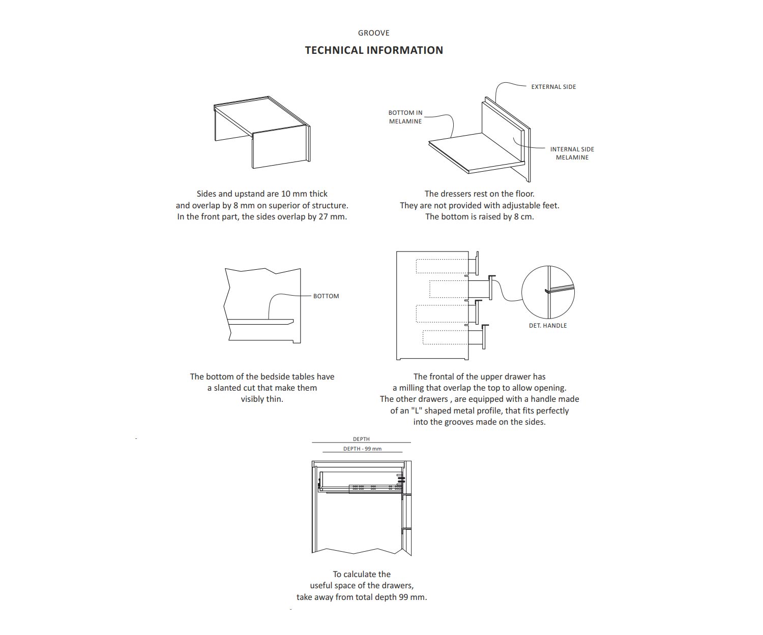 Die Frontplatten sind mit eleganten „L“-förmigen Metallgriffen ausgestattet, die perfekt in die Rillen an den Außenseiten passen und für ein nahtloses Erscheinungsbild sorgen. Im Inneren sind die Strukturen aus hochwertigem Melamin gefertigt, was sowohl Funktionalität als auch Langlebigkeit gewährleistet.