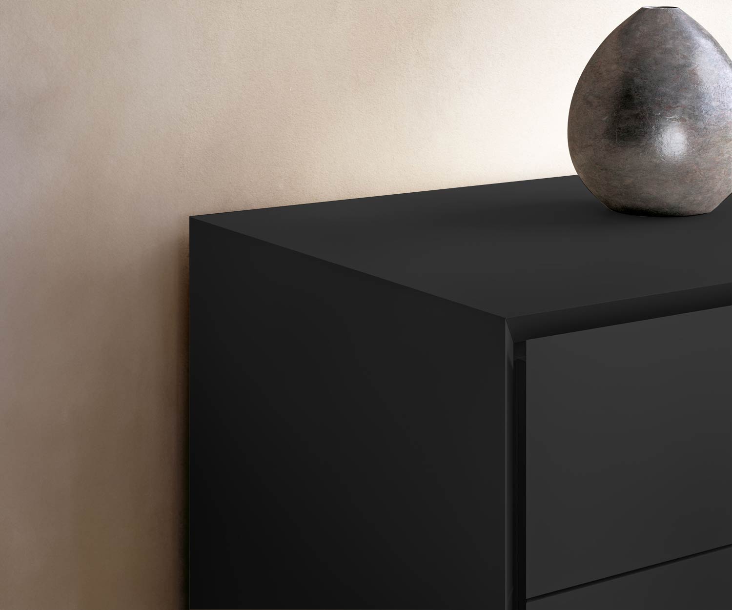 Die Designer Kommode ist in 5 matten Farben erhältlich: GR3 Beige (ähnlich RAL1019), GN1 Weiß (ähnlich RAL9016), GN5 Hellgrau (ähnlich RAL7040), GN7 Dunkelgrau (ähnlich RAL7043) und WN9 Schwarz (ähnlich RAL9017). Wählen Sie dafür im Konfigurations-Menü einfach Ihre Wunschfarbe aus – schon haben Sie Ihr neues Sideboard im individuellen Design konfiguriert.