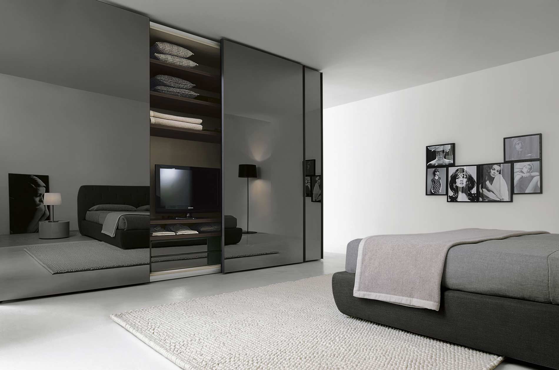 Drei große Spiegelschiebetüren in verschiedenen Breite Ausführung geben dem Design Kleiderschrank mit seiner geradlinigen Form die moderne Eleganz. Die Seitenwände sind matt lackiert und geben dem Schrank dadurch einen schönen Kontrast.