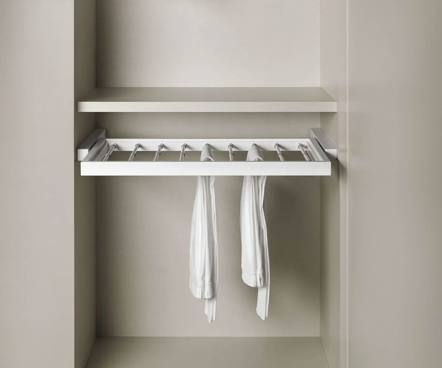 Armadi Hosenhalter aus Aluminium für Kleiderschränke von Novamobili und Livitalia. Einfache und faltenfreie Aufbewahrung von Hosen aller Art. Der Hosenhalter lässt sich dank hochwertiger Gleitschienen einfach und leise herausziehen.