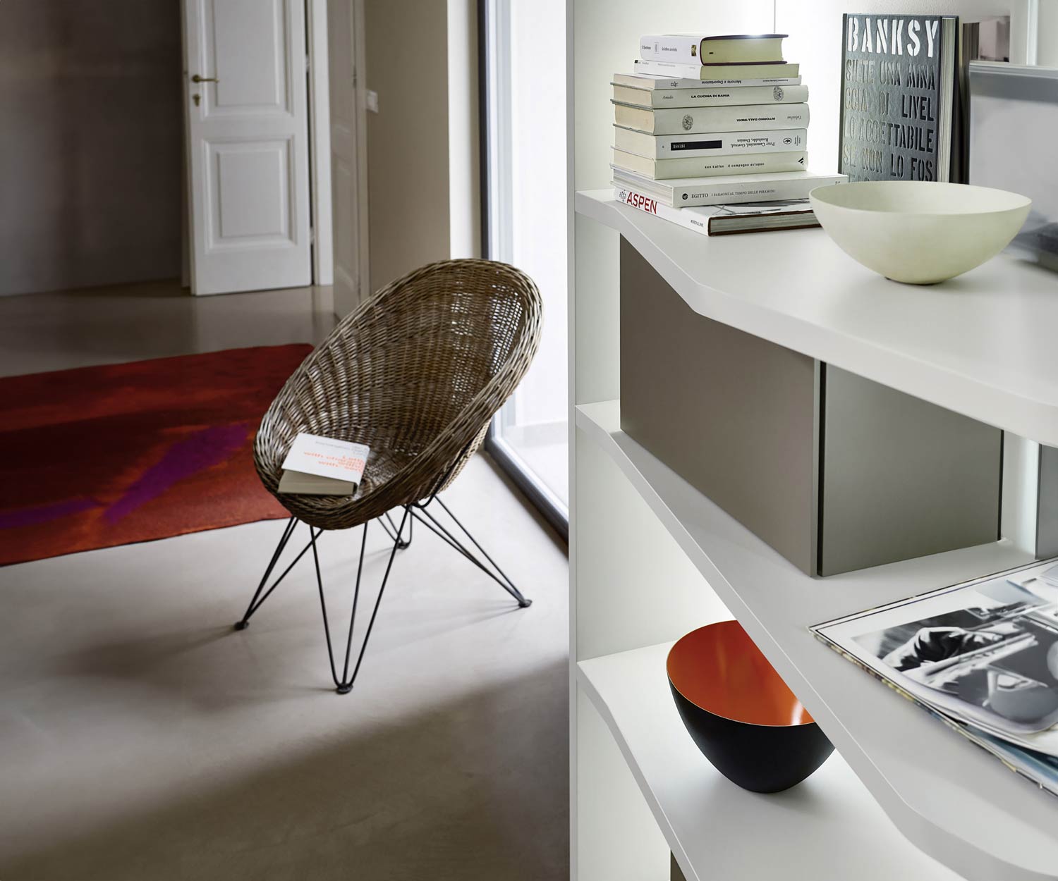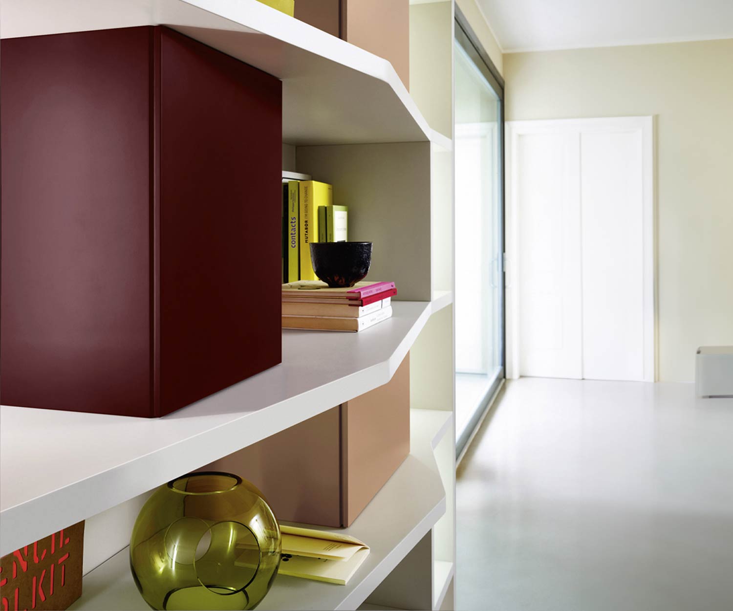 Das Regal besteht aus MDF und ist je nach Ausführung lackiert oder furniert.