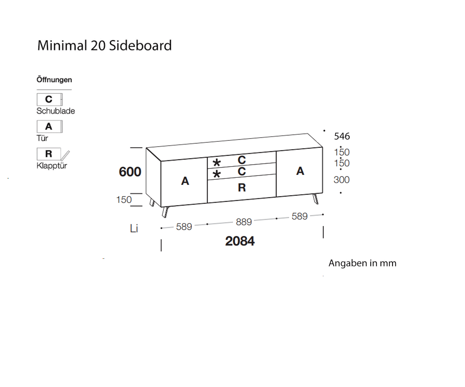 Korpus und Front bestehen aus Holzspanplatten. Sockel und Füße bestehen aus Metall; die Füße sind aus lasergeschnittenem Stahl.