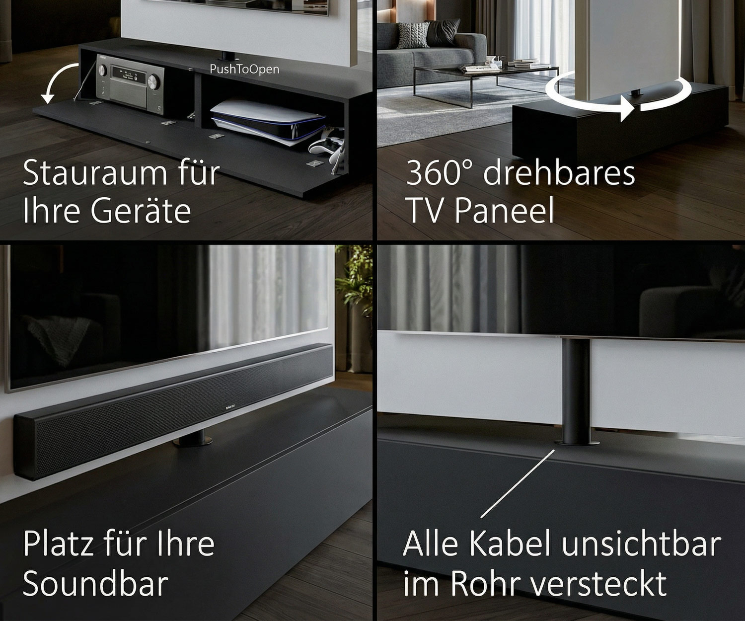 Das Besondere an diesem Design-Möbel: Es ist komplett freistehend drehbar. Die TV-Säule lässt sich um 360° schwenken, sodass Sie aus jeder Perspektive fernsehen können – egal ob vom Sofa oder vom Esstisch aus.