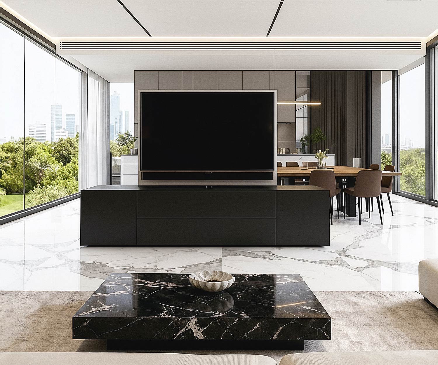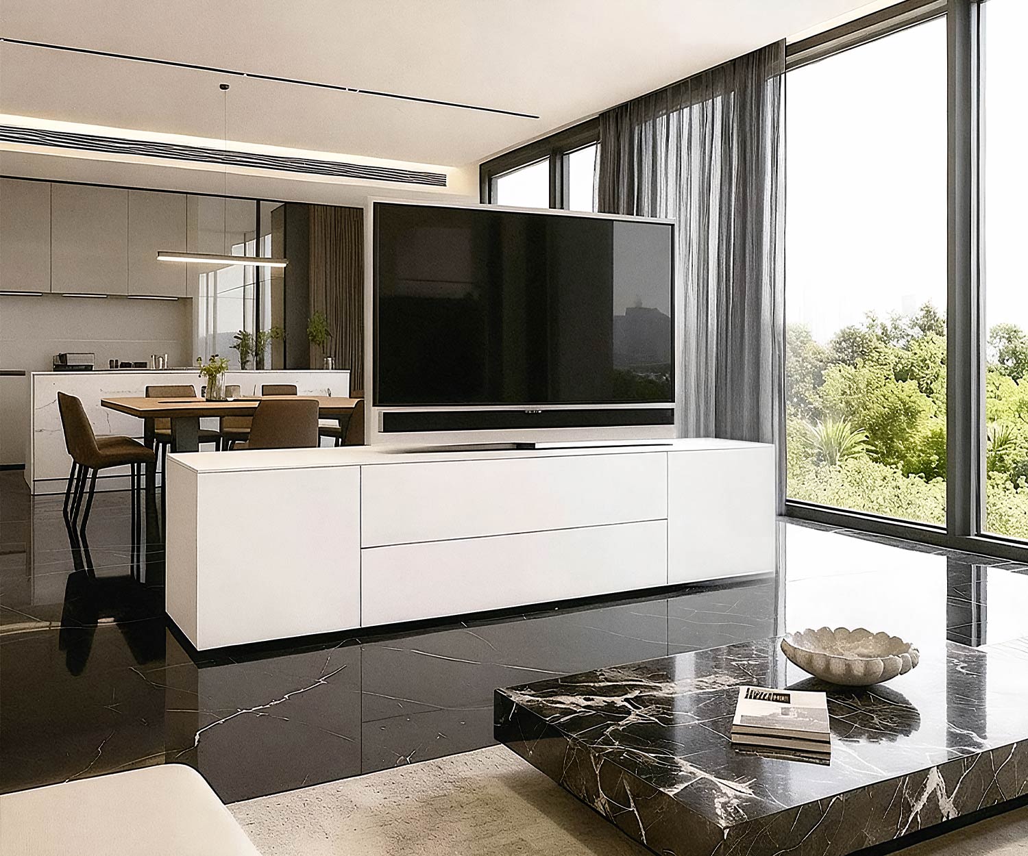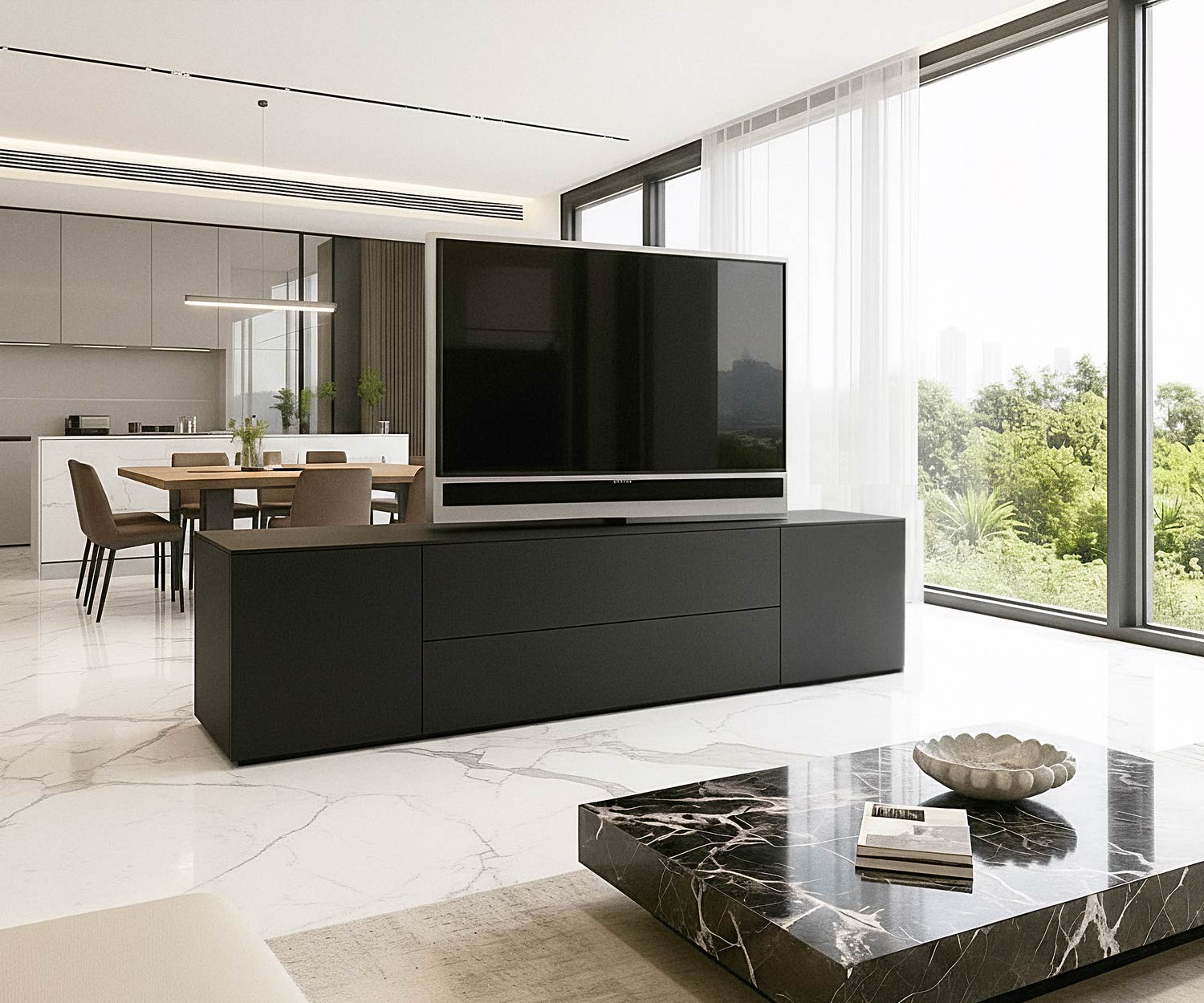 Das Livitalia Roto Designer Sideboard verbindet modernes Design mit maximaler Flexibilität. Dank des drehbaren TV-Paneels eignet es sich perfekt als stilvoller Raumteiler zwischen Wohnzimmer und Küche. Vorder- und Rückseite sind identisch gestaltet, sodass das Sideboard von beiden Seiten gleichermaßen elegant wirkt und sich nahtlos in jedes Raumkonzept einfügt.