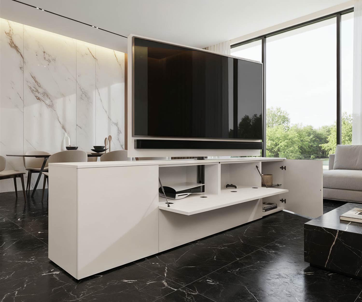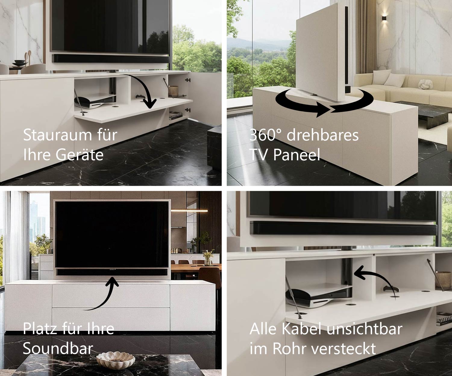 Das drehbare TV-Paneel ist das Highlight des Sideboards: Es lässt sich um bis zu 360° drehen und bietet damit maximale Flexibilität bei der Nutzung. Mit einer Breite von 146,5 cm und einer Höhe von 105 cm ist es für Fernseher bis 65 Zoll geeignet. An das Paneel kann eine individuelle Wunschhalterung angebracht werden, sodass nahezu jedes TV-Gerät sicher montiert werden kann.