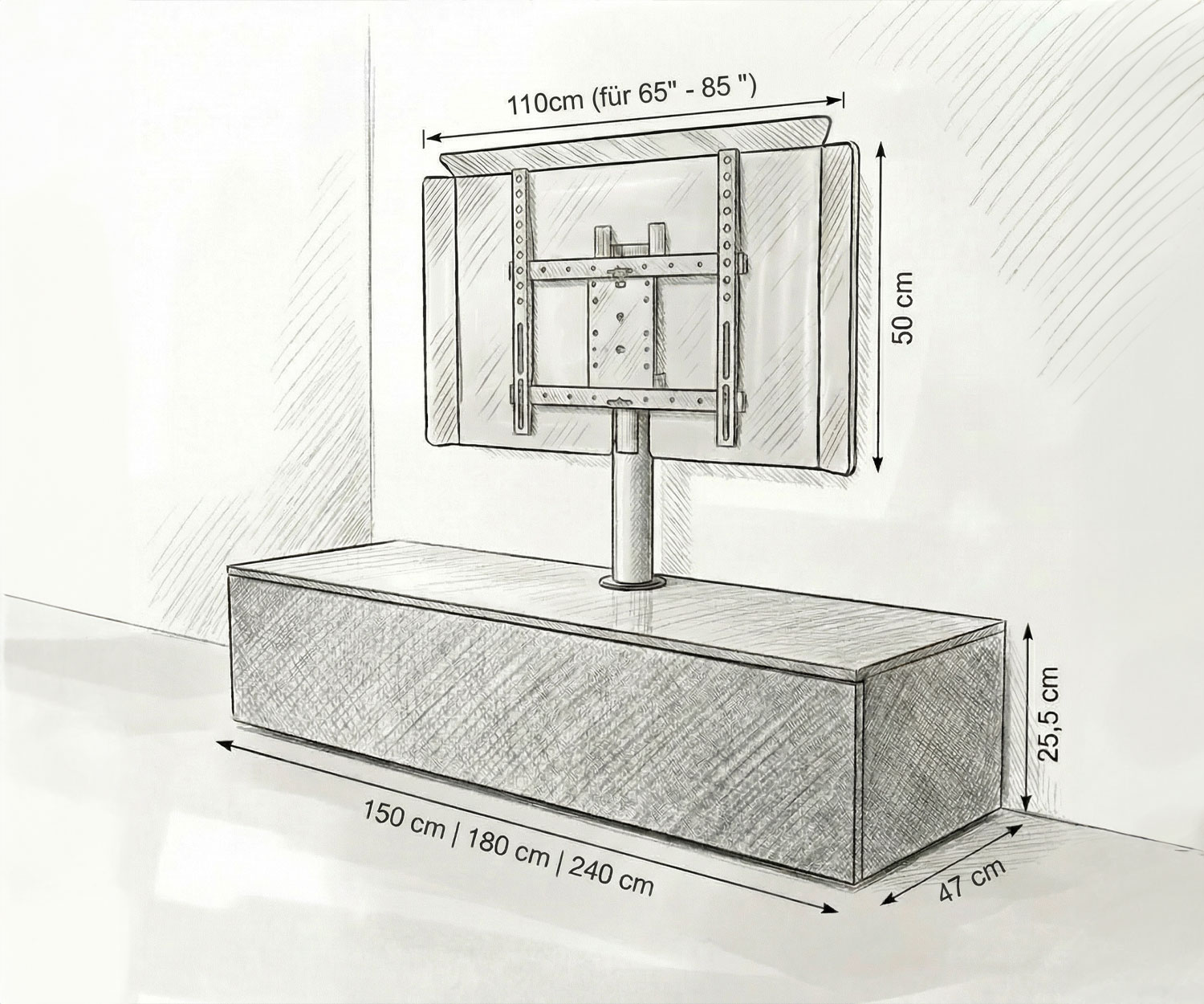 Prüfen Sie die Kompatibilität Ihres 85-Zoll-Fernsehers mit unserem 24 cm hohem Lowboard und der mitgelieferten Halterung.