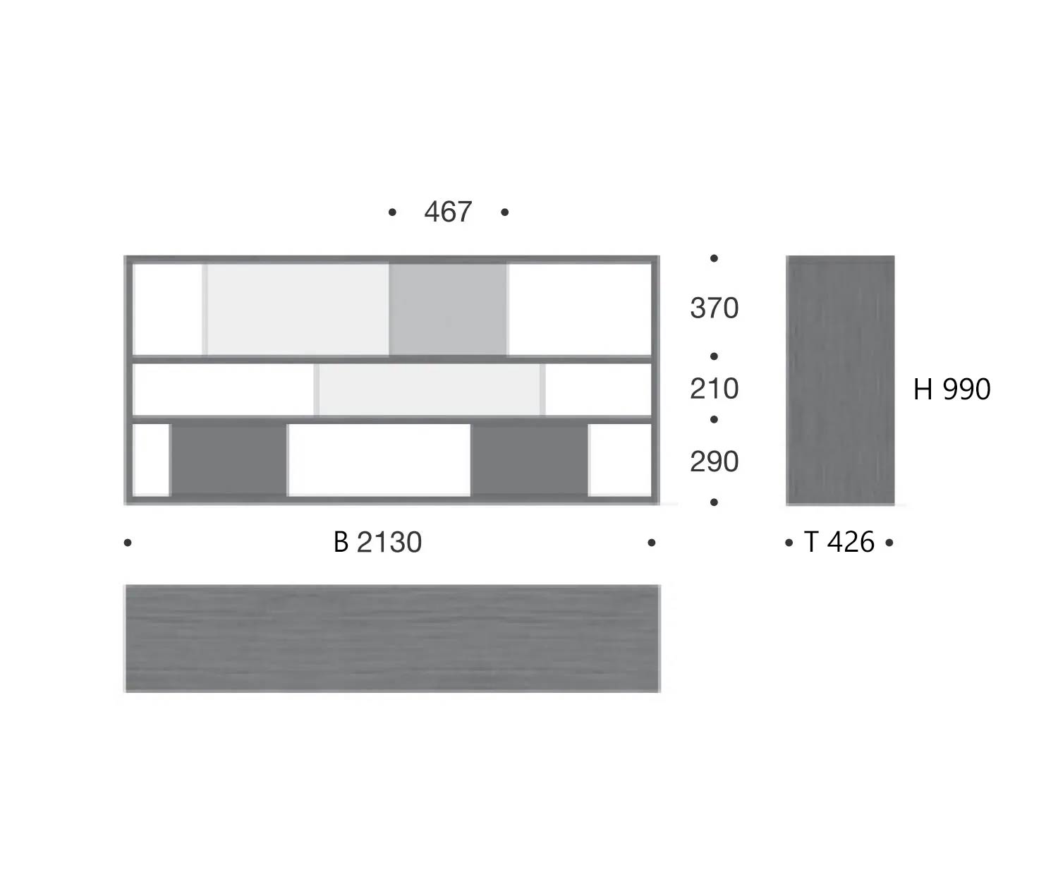 Die Außenmaße des Standregals sind: B 213 cm / H 99 cm / T 42,6 cm