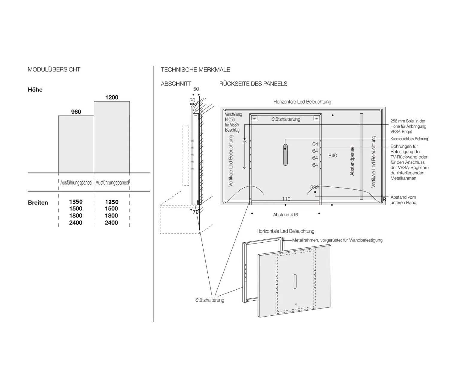 Folgende Maße sind für das TV Paneel erhältlich