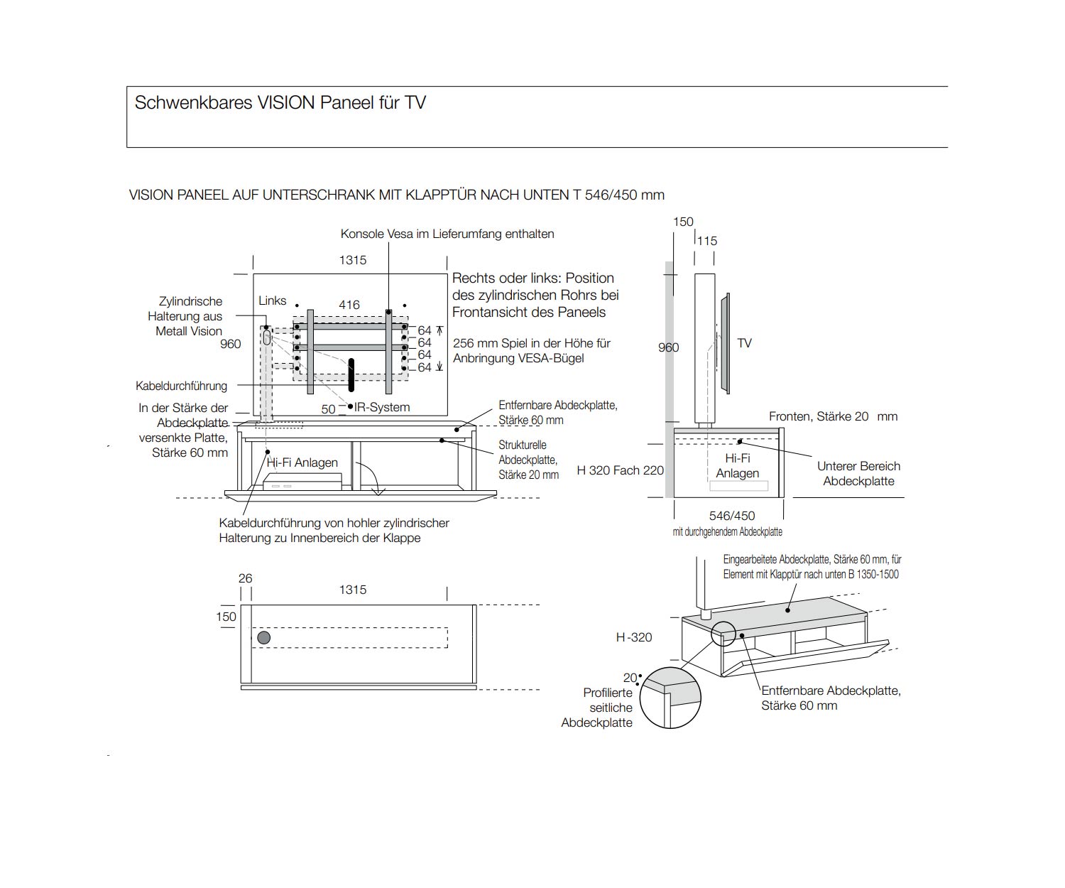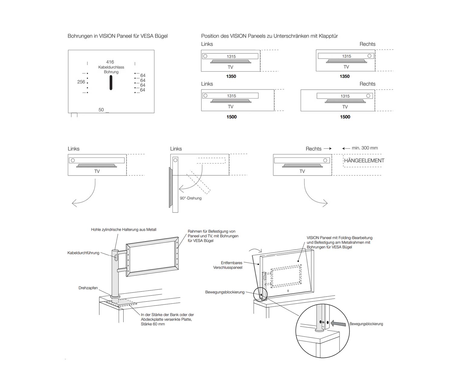 Durch Druck auf die Front kann die Klapptür geöffnet werden. Im Inneren befindet sich eine Trennwand sowie ein Rohr, welches die Kabel der Geräte im Inneren des Lowboards mit dem Fernseher verbindet. Das TV Paneel kann um bis zu 90° geschwenkt werden. Das schwenkbare Vision TV Paneel hat eine Breite von 131,5 cm und kann maximal mit einem TV Gerät von 58 Zoll Größe bestückt werden. An das Paneel kann eine Wunschhalterung nach Wahl gehangen werden. Im inneren des TV Paneels befindet sich ein Stahlträger in Flaggenform, der für die nötige Stabilität sorgt.