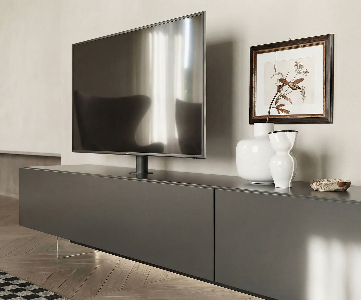 Elegante Design Wohnwand C43 von Livitalia aus Italien. Das flache Lowboard steht auf transparenten Füßen und verfügt über eine TV Halterung, an der auch Curved TV'S aufgefangen werden können. Die große Glasvitrine verfügt über eine optionale LED Beleuchtung. Individuelle Anpassungen sind auf Anfrage möglich.