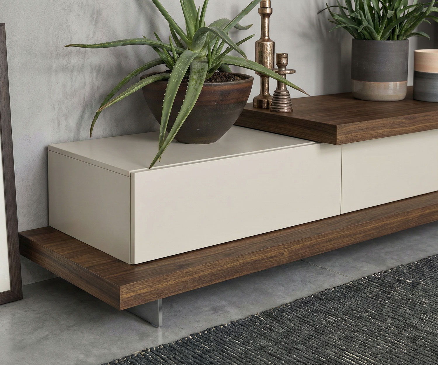Die Livitalia C52 ist eine besondere Design Wohnwand aus Italien mit integrierter Säulen TV Halterung. An diese kann ein bis zu 55 Zoll großer Flachbildfernseher gehangen werden. Die Kabel werden unsichtbar in der Säule nach unten in das offene Mediafach geleitet. Je nach Größe des Fernsehers lässt sich die Halterung nach links und rechts drehen.