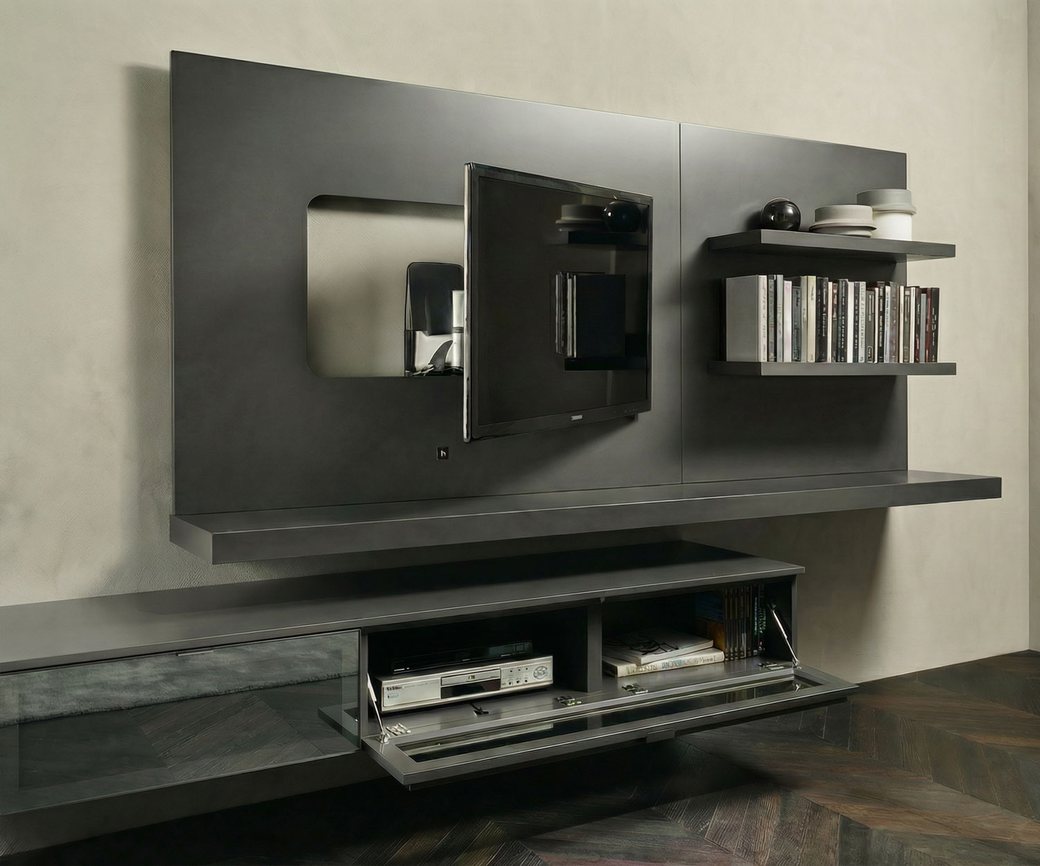 Schwebende TV Design Wohnwand C54 von Livitalia aus Italien. Die Wohnwand besticht durch ein TV Paneel mit schwenkbarer TV Halterung und Lowboard mit Infrarot Klapptüren. Diese in Silber verspiegelte Tür lässt die Infrarotstrahlen Ihrer Fernbedienung durch, ohne die Klapptür öffnen zu müssen. Individuelle Anpassungen sind auf Anfrage möglich.