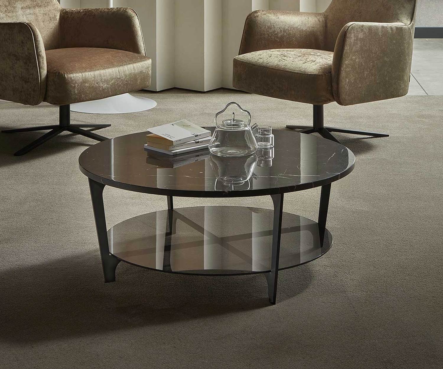 Der Marelli Tab Couchtisch wird nur auf Bestellung in Italien gefertigt. Das Design besticht durch eine massive Marmor Tischplatte und ein graziles Stahlgestell mit Glasplatte.