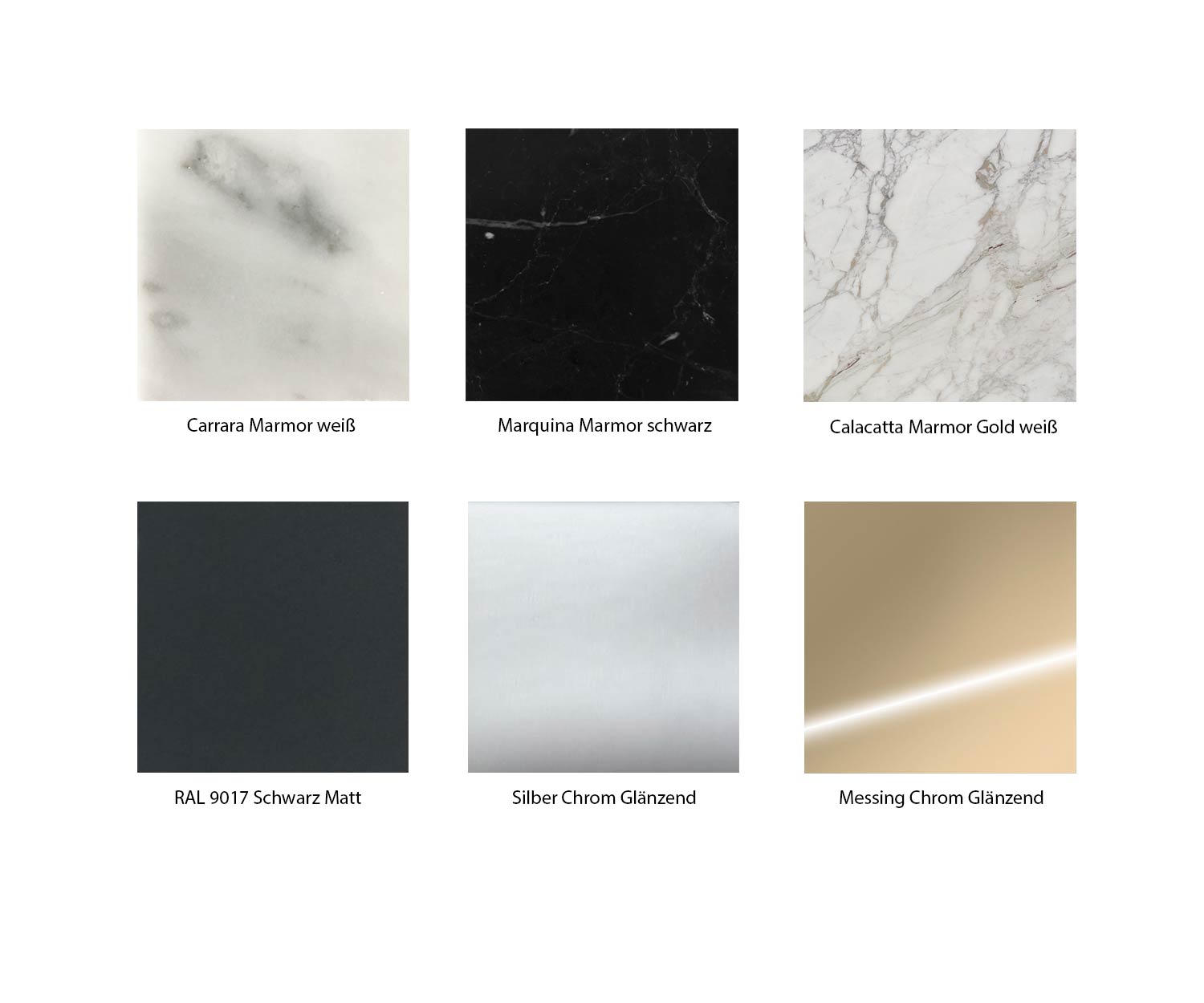 Bei diesem Luxus Esstisch von Marelli besteht die Tischplatte wahlweise aus edlem Carrara Marmor oder weiteren hochwertigen Sorten wie Marquina Marmor Schwarz und Calacatta Gold. Die Füße des Untergestells sind aus Metall und in einer matten oder glänzenden Farbe lackiert. Das Gestell des Esstischs ist aus Stahl und in RAL 9017 Matt Schwarz, Chrom Silber oder Messing Gold glänzend zu beziehen. Sollte eine Imprägnierung als Option gewählt sein, wird diese in X-Stone oder als Polyester Coating ausgeführt.