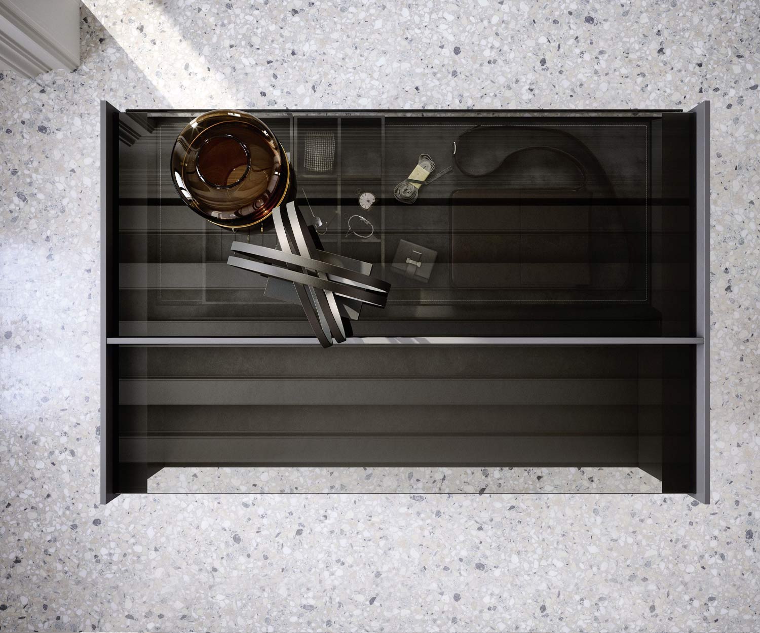 Die 2 oberen Ablageflächen mit Glasfront verfügen über eine Front aus grau schattiertem Glas C80 mit einer Stärke von 0,6 cm, eingefasst in einen Aluminiumrahmen. Die Schubladen sind mit einem gedämpften Schließmechanismus sowie einem Vollauszug ausgestattet. Die Seitenhöhe dieser Schubladen beträgt 5 cm.