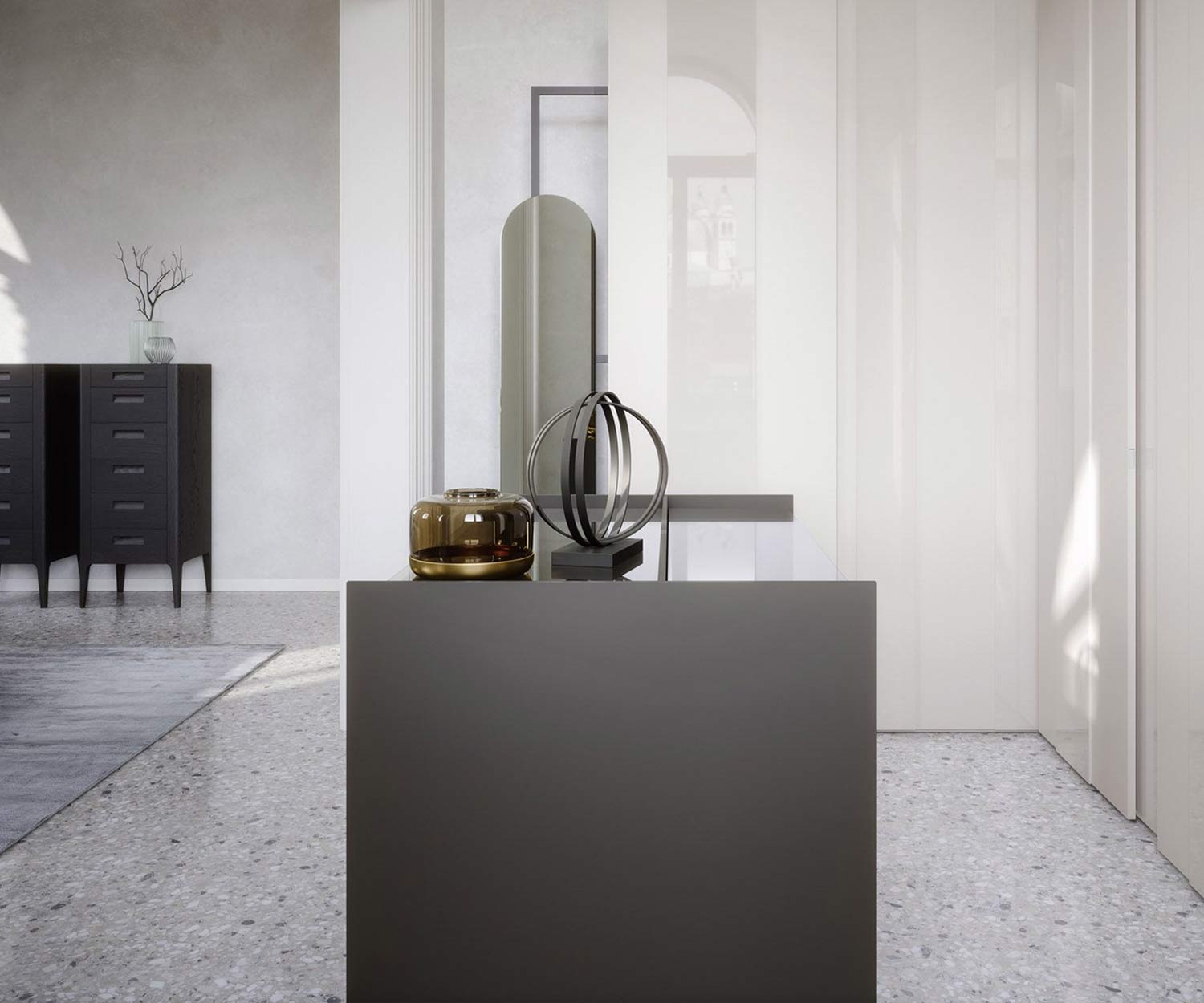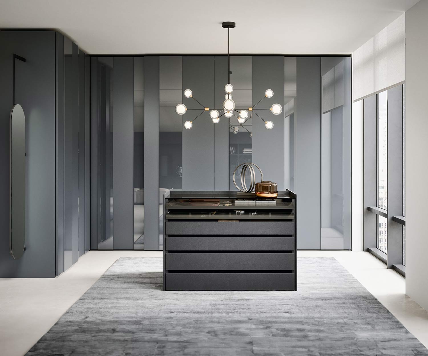 Die Mittelinsel Aristotele ist ein beidseitig nutzbares Schrankelement, das sich perfekt in die Raummitte eines begehbaren Kleiderschranks integrieren lässt. Sie vereint ästhetisches Design mit praktischer Funktionalität und bietet durch ihre durchdachte Innenaufteilung reichlich Platz für Accessoires, Schmuck, Krawatten, Gürtel und weitere Kleidungsstücke.