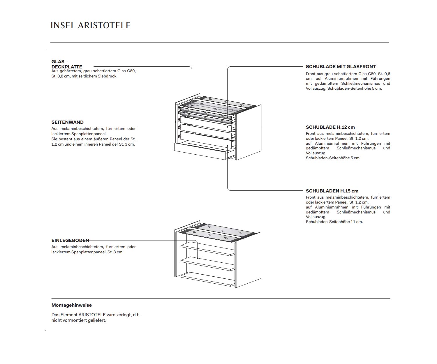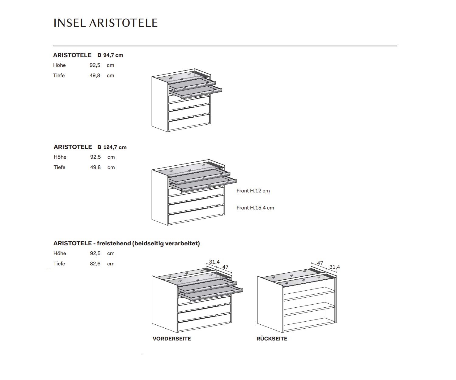 B 124,7 cm / H 92,5 cm / T 82,6 cm: freistehende Ausführung mit beidseitiger Verarbeitung für den Zugang auf beiden Seiten der Mittelinsel, Ausstattung Vorderseite mit 6 Schubladen/ Hinterseite mit 3 Einlegeböden