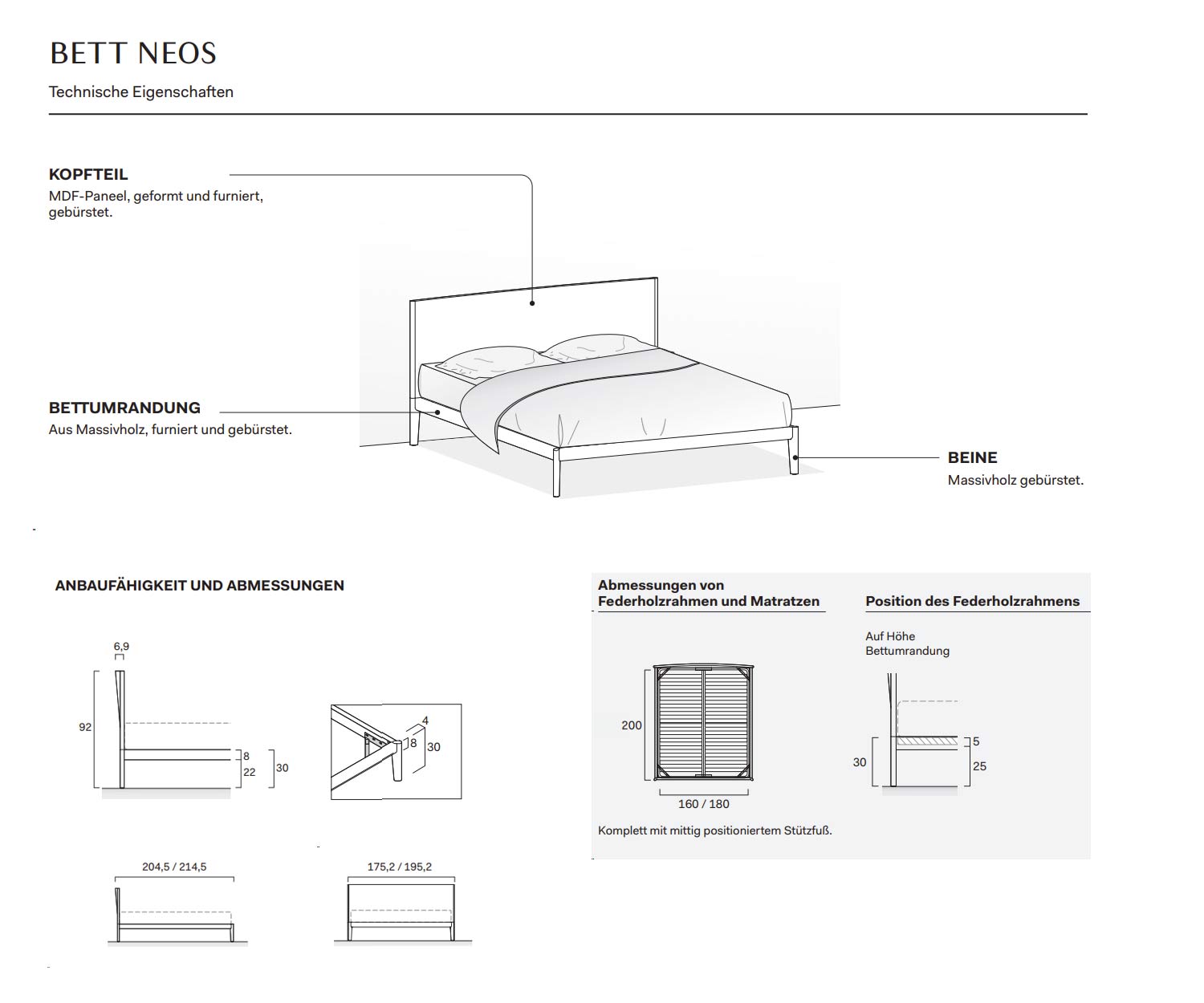 Beim Kopfteil besteht der Korpus aus MDF-Paneel, dieser ist furniert, geformt und gebürstet. Der Kopfteil ist überzogen mit weichem Stoffbezug. Es ist mit einem abziehbaren Stoffbezug versehen. Bei der Bettumrandung und den Beinen handelt es sich um Massivholz, die furniert und gebürstet ist.