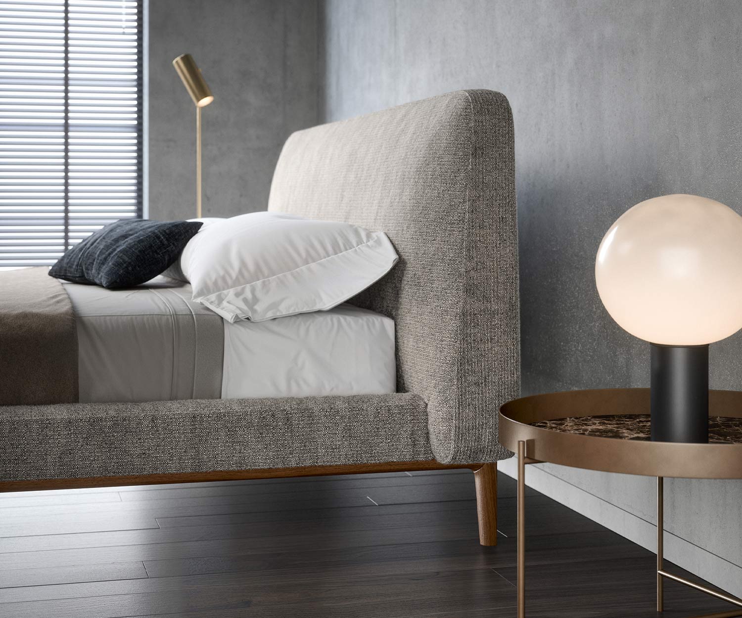Die Holzbeine sowie das Bettuntergestell seitlich sind erhältlich in Nussbaum (N03 Noce Canaletto) oder schwarz gebeiztes Eschenholz (N05 Rovere Carbone).
