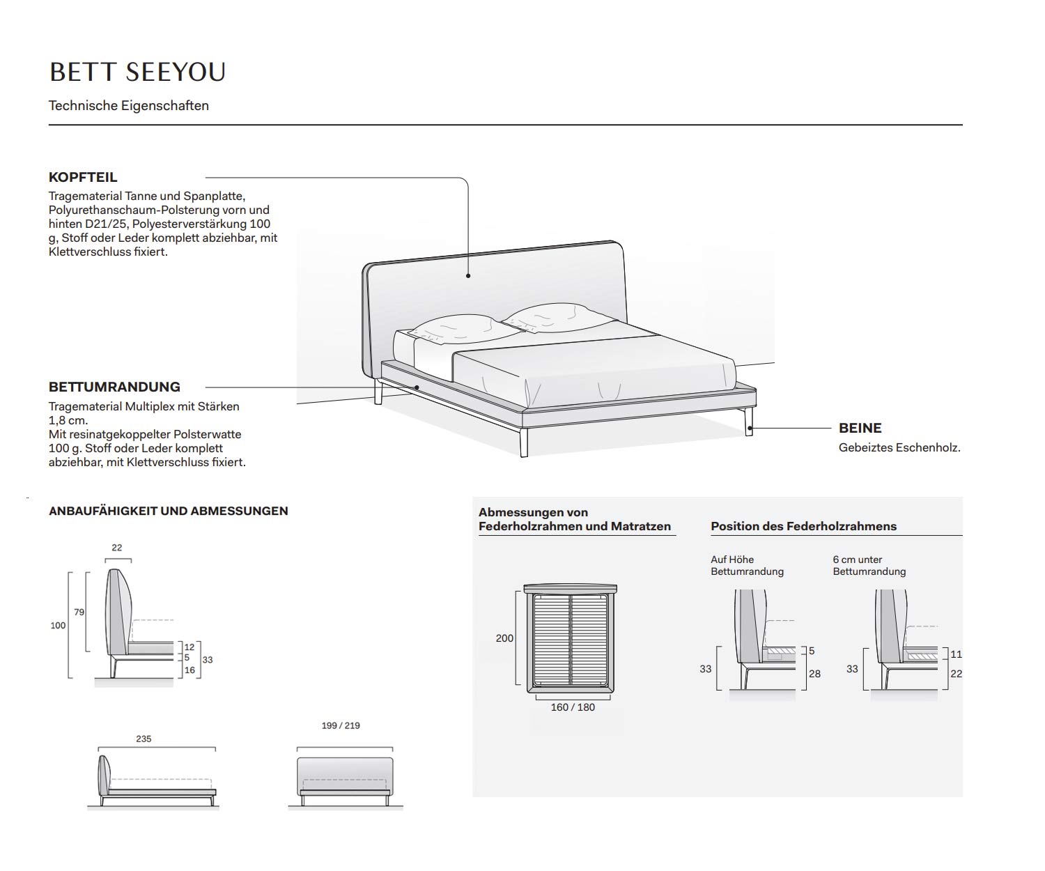 Das Kopfteil des Bettes besteht aus Tanne und Spanplatte als Tragematerial. Es ist mit Polyurethanschaum (D21/D25) sowohl vorne als auch hinten gepolstert und hat eine Polyesterverstärkung von 100g. Mit abziehbarem Stoffbezug.