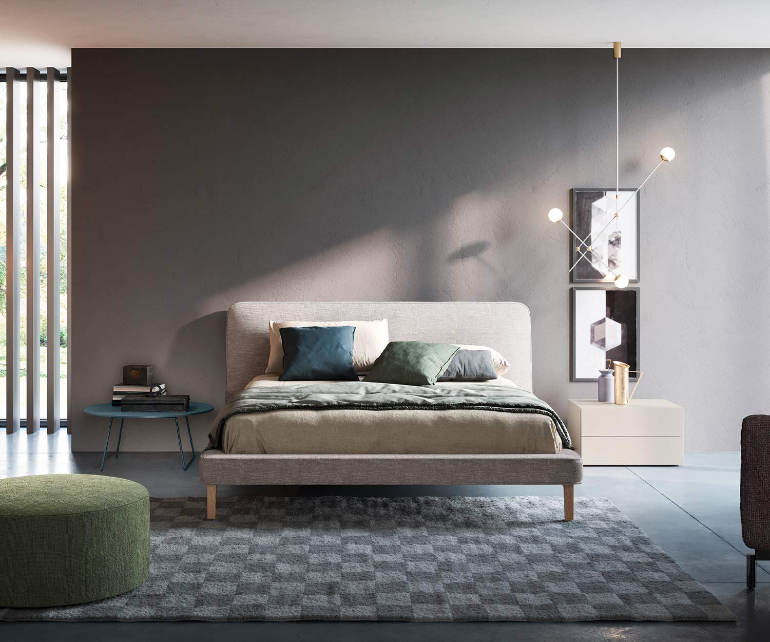 Je nach Schlafzimmerdekoration kann das Novamobili Seeyou Designer Polsterbett in 4 Farben produziert werden. Zur Auswahl stehen: Türkis, Creme Beige, Hellgrau und Dunkelgrau.