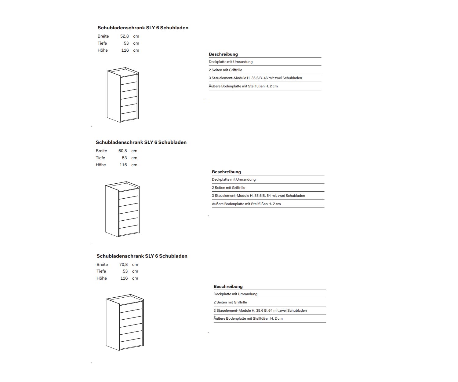 B 52,8 cm / H 116 cm / T 53 cm (6 Schubladen)