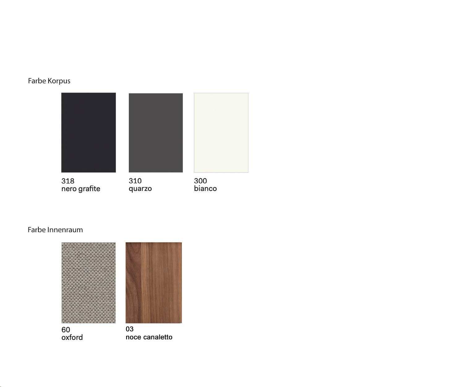 Der Korpus und das Innenleben bestehen aus hochwertigen MDF mit einer porenfreien Kunststoff-Melaminbeschichtung. Für die anschließende Lackierung werden ausschließlich Wasserlacke verwendet, die 95% umweltschonender sind als herkömmliche Lacke. Bei der Auswahl der gerippten oder getönten Glastüren handelt es sich um gehärtetes Glas. Die Metallrahmen der Glastüren sind braun brüniert und besonders schlank. So wird der Blick auf die Kleidung nicht behindert.