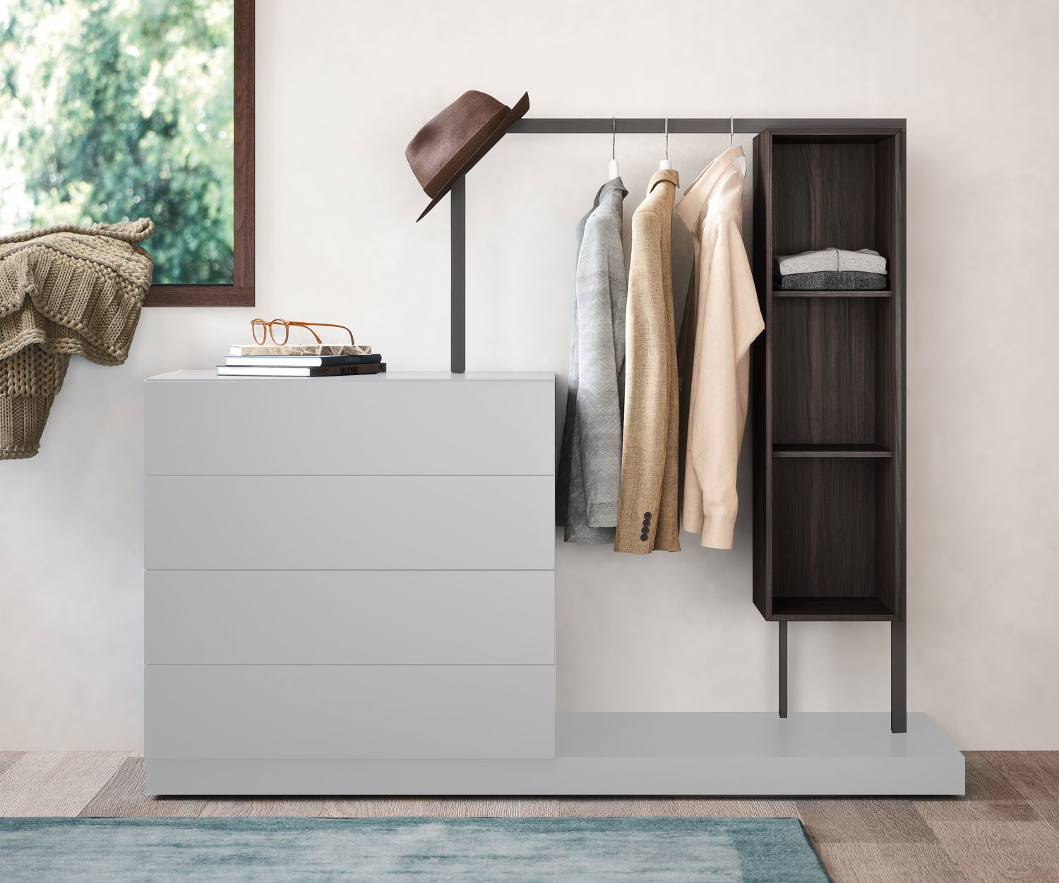 Die italienische Design Kommode Easy 4 mit Garderobe von Novamobili bietet sich als stummer Diener an, der Ordnung in das Schlafzimmer oder den Flur bringt. Das modulare System der Serie lässt sich optimal konfigurieren und sorgt für Stauraum und genügend Platz zur Aufbewahrung. Die praktische Kommode mit Kleiderstange wird auf Bestellung in Italien produziert.
