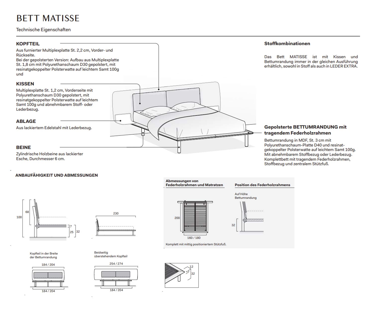 Beim Kopfteil besteht der Kopfteil aus furnierter Multiplexplatte mit 2,2 cm Dicke. Die Kissen am Kopfteil bestehen aus Polyurethanschaum D30, mit resinatgekoppelter Polsterwatte auf leichtem Samt. Es ist mit einem abziehbaren Stoff- und Lederbezug versehen.