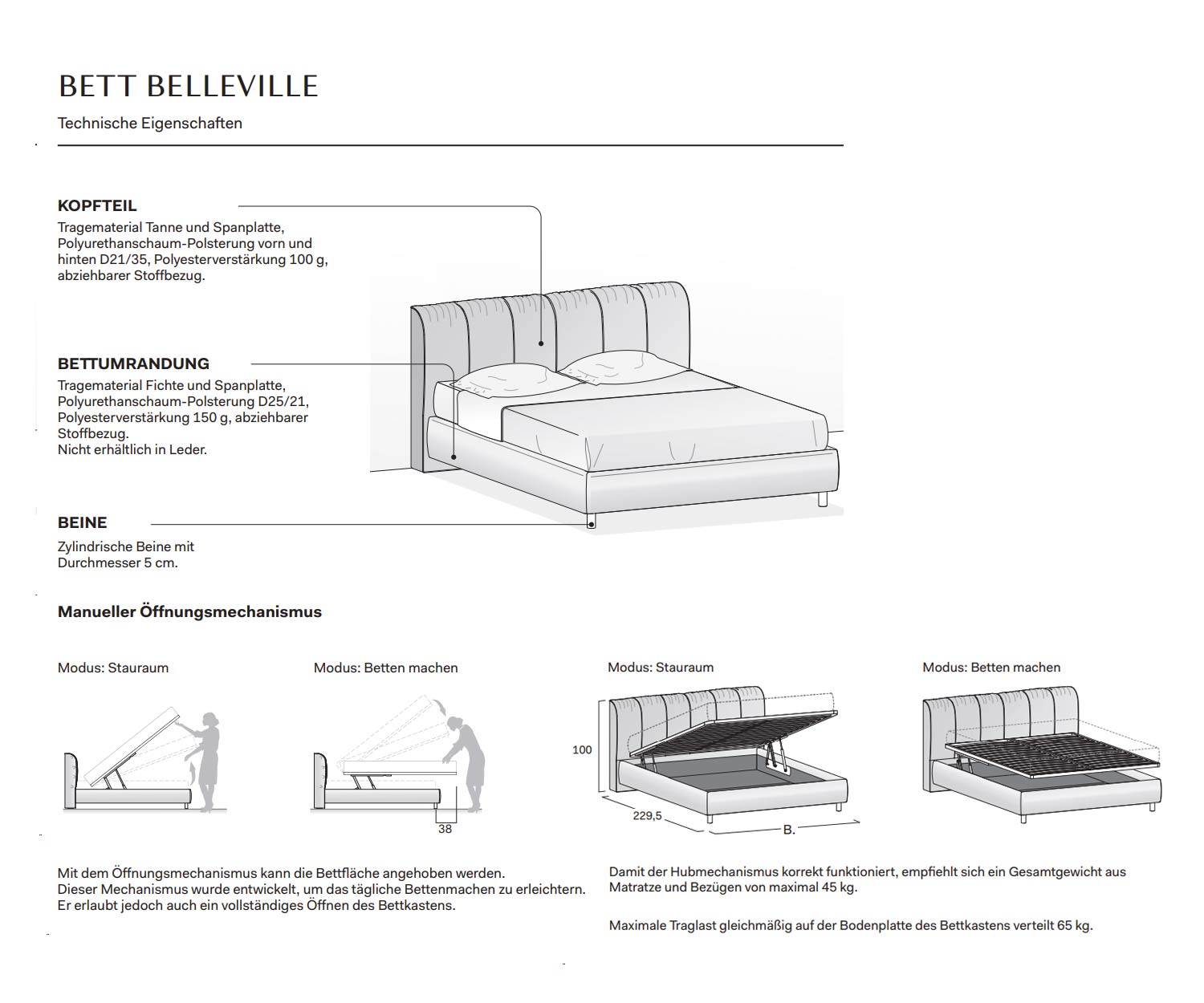 Der Preis des Bettes umfasst den Federholzrahmen und den Mechanismus mit einem doppelten Öffnungssystem, jedoch ohne Matratze. Es wird empfohlen, dass das Gesamtgewicht aus Matratze und Bezügen 45 kg nicht überschreitet, damit der Hubmechanismus einwandfrei funktioniert. Die maximale Traglast, die gleichmäßig auf der Bodenplatte des Bettkastens verteilt werden sollte, beträgt 65 kg.