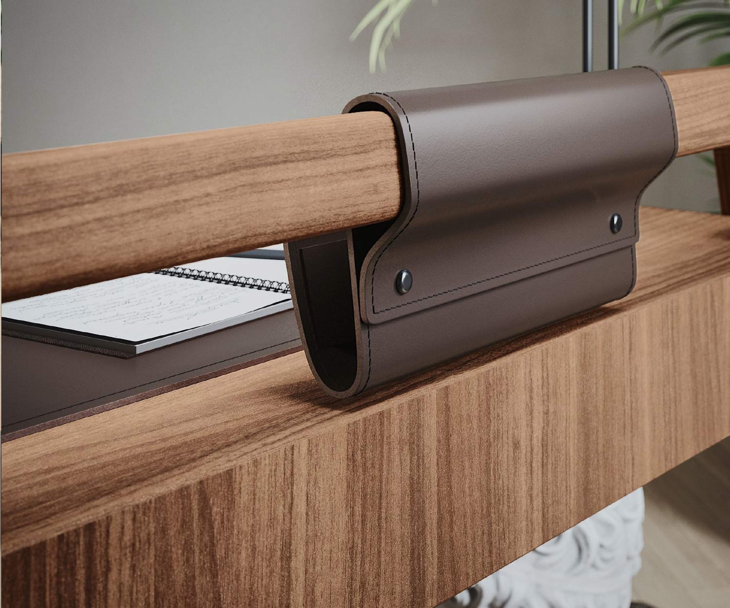 Der Knot Schreibtisch ist in Nussbaumholz Canaletto N03 erhältlich. Die Schreibtisch Accessoires bestehen aus glattem Leder im dunkelbraunem Finish.
