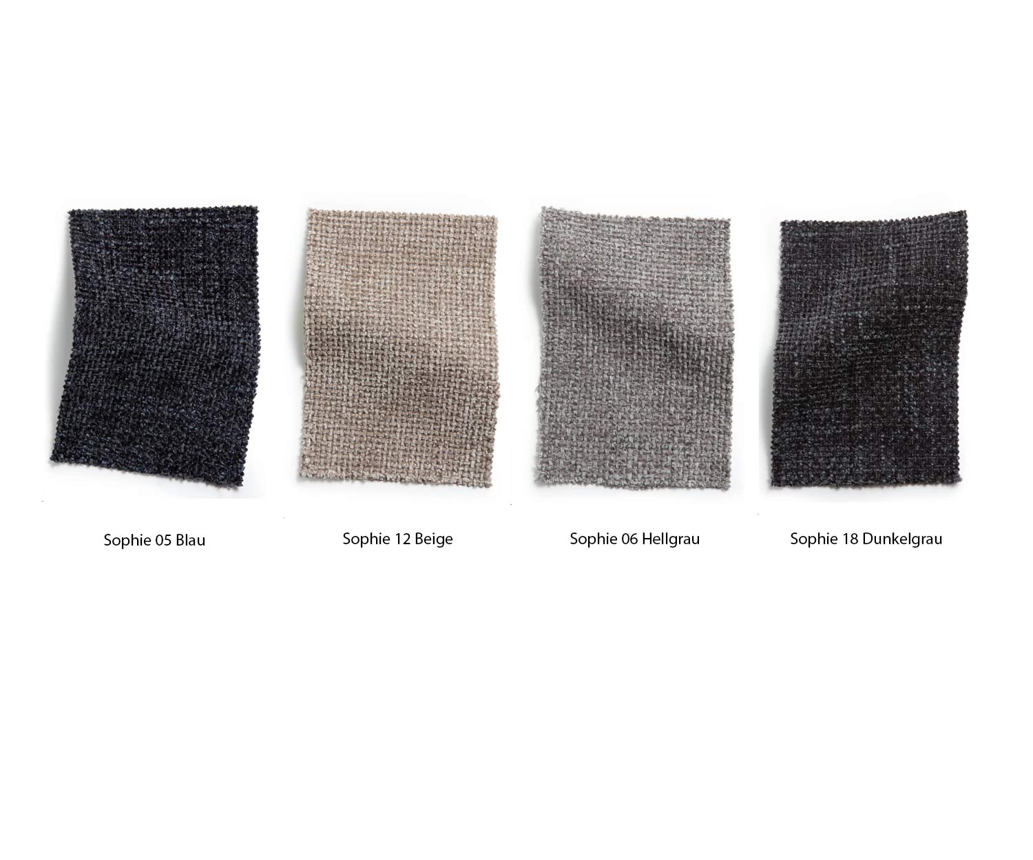 Der hochwertige Sophie Bezug ist in 3 Farben erhältlich: Beige, Schwarz Grau und Hellgrau. Sein besonders grobes Garn sorgt für eine außergewöhnliche Optik. Auf Anfrage sind auch andere Stoffe möglich.