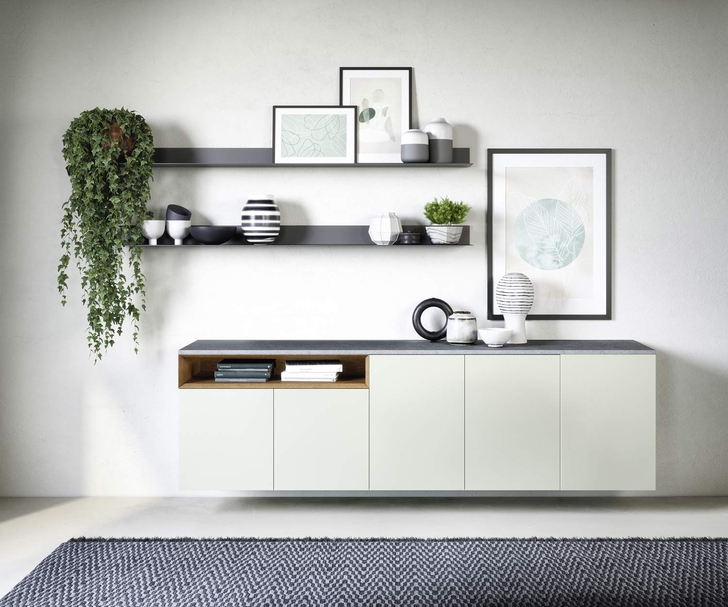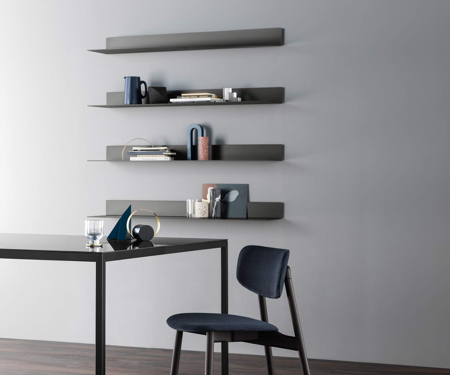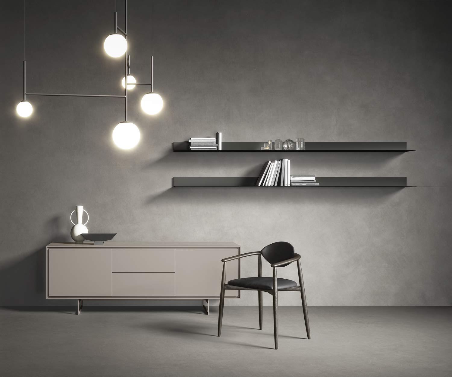 Modernes und besonders flaches Design Wandregal aus lackiertem Metall. Das 2mm starke Metallregal hat eine unsichtbare Wandaufhängung und kann wahlweise mit oder ohne LED Beleuchtung bestellt werden. Das Wandboard Ellie wird nur auf Bestellung bei Novamobili in Italien gefertigt.