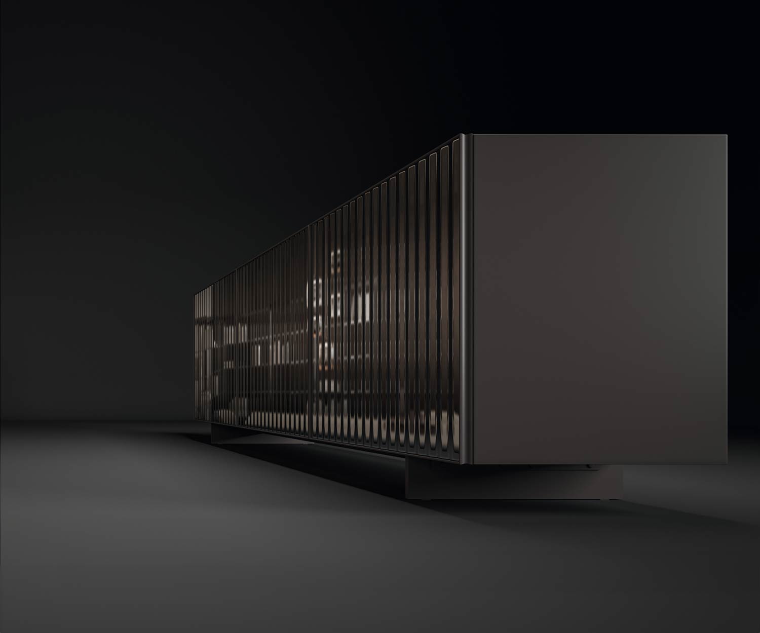 Das Alfetta Sideboard von Ozzio beeindruckt durch seine funktionalen geriffelten Sideboard Glastüren, die über eine Vertiefung über der Tür leicht geöffnet und geschlossen werden können. Dadurch vermeiden Sie Fingerabdrücke auf der Tür. Sie bieten großzügigen Stauraum für all Ihre Lieblingsstücke. Hinter jeder Spiegeltür befindet sich ein praktischer Glaseinlegeboden.