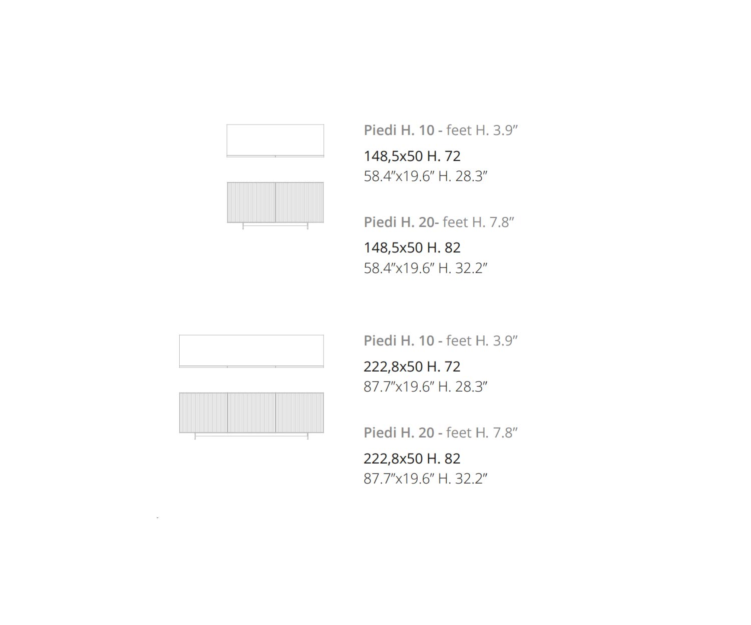 B 222,8 cm / H 72 cm / T 50 cm / Füße H 10 cm (mit 3 Türen)