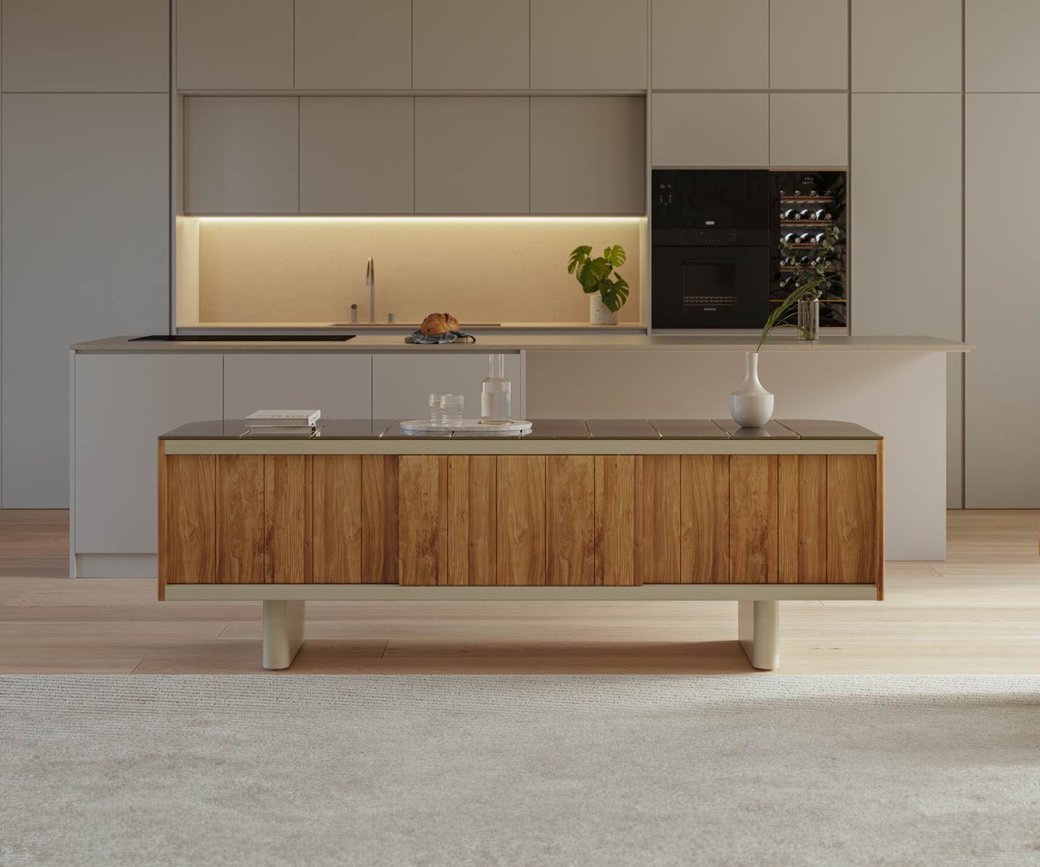 Das Atrio Designer Sideboard von Punt ist mit dem Korpus und der Front im natürlichem Teakholz erhältlich. Die Abdeckplatte ist erhältlich in handgefertigten Keramikstücken oder Dektonplatten und ist in der glasierten Keramikfarbe Grün Craquelé Keramik oder in der mattenDektonfarbe Creme Weiß Nacre erhältlich. Die Innenstruktur, Beine und Kufen bestehen aus beige pulverbeschichtetem Aluminium.