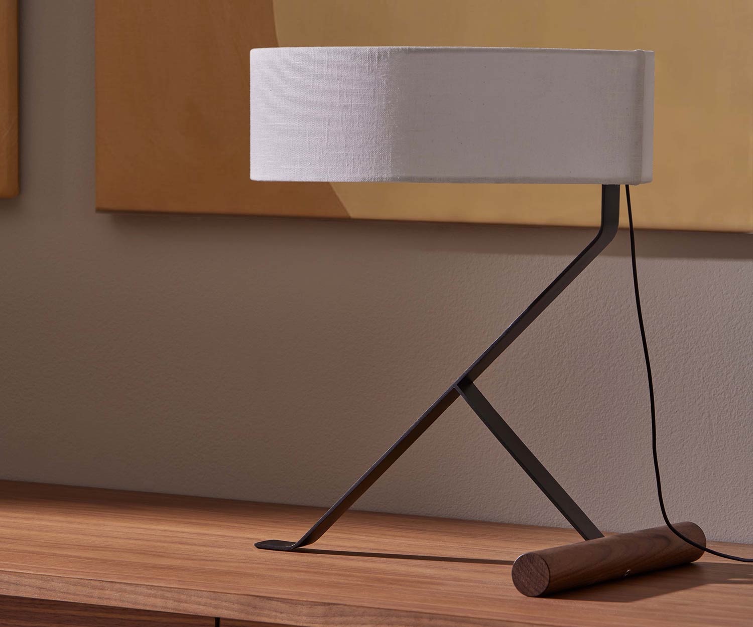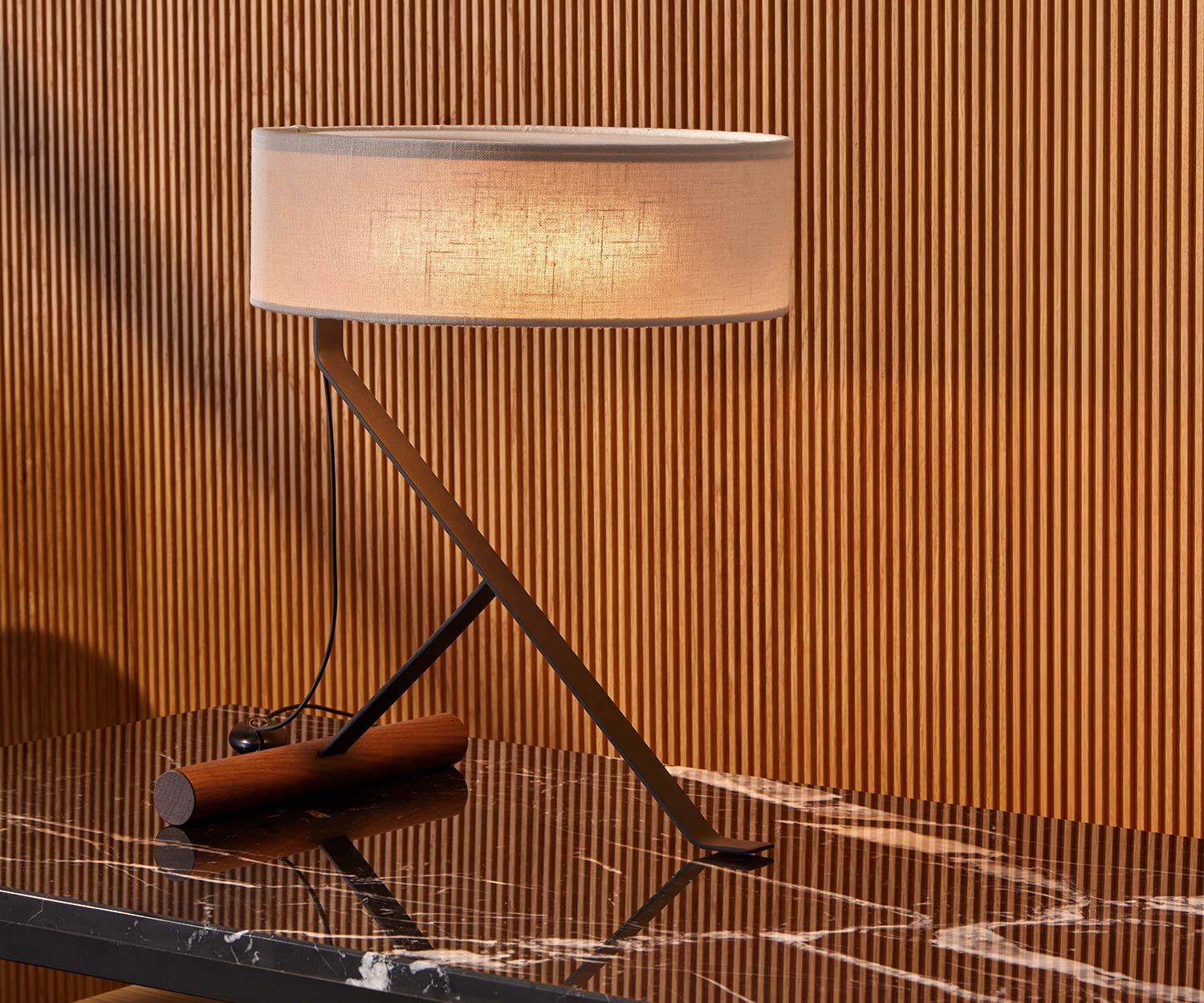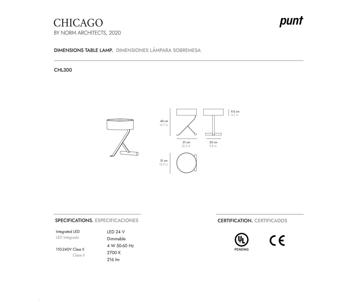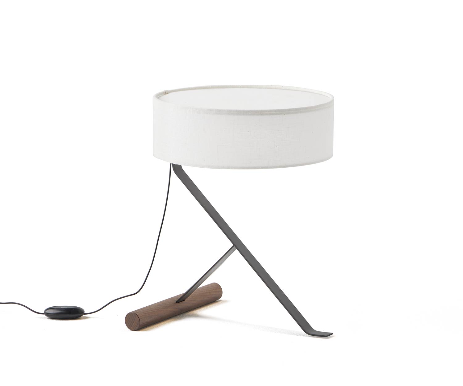 Der Lampenschirm der Punt Chicago Tischlampe ist überzogen in natürlicher Baumwolle. Die Konstruktion besteht aus Nickel schwarzem Metall und einem Standfuß in Super Matt Walnuss.
