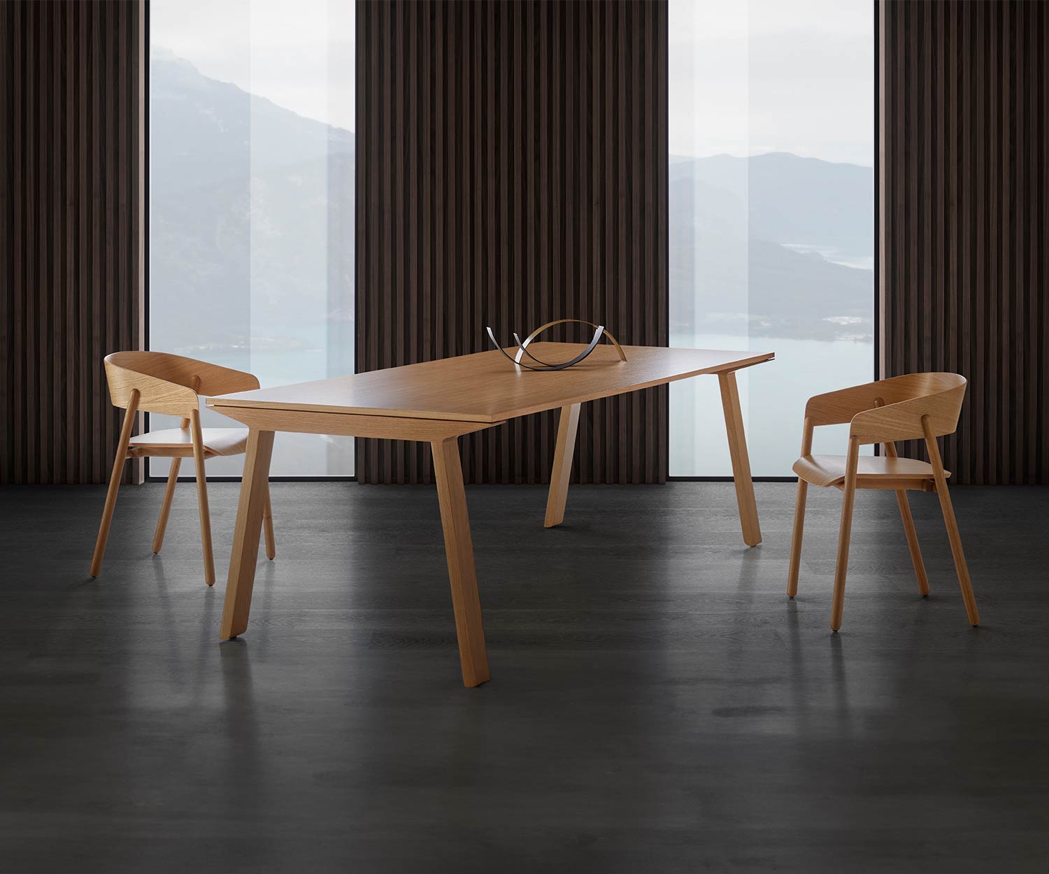 Der Mava Designer Stuhl von Punt wird nur auf Bestellung für Sie in Spanien gefertigt. Die Produktion geschieht per Hand. Das Gestell ist aus massiver Eiche Hell, Walnuss gebeizte Eiche oder Schwarz gebeizte Eiche. Sitzfläche und Rückenlehnen sind aus geformtem Schichtholz mit Echtholzfurnier. Die Beine haben integrierte Filzgleiter.