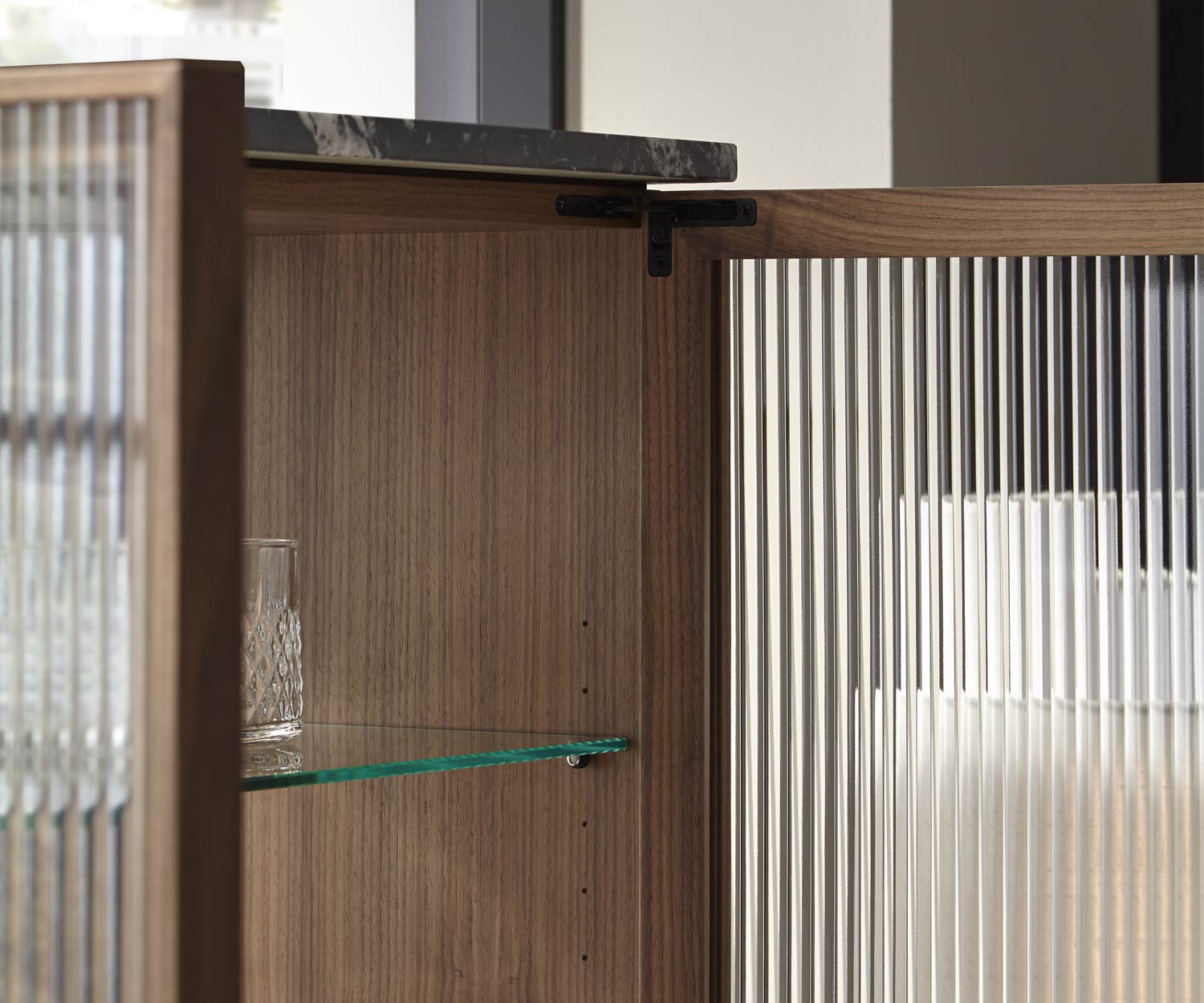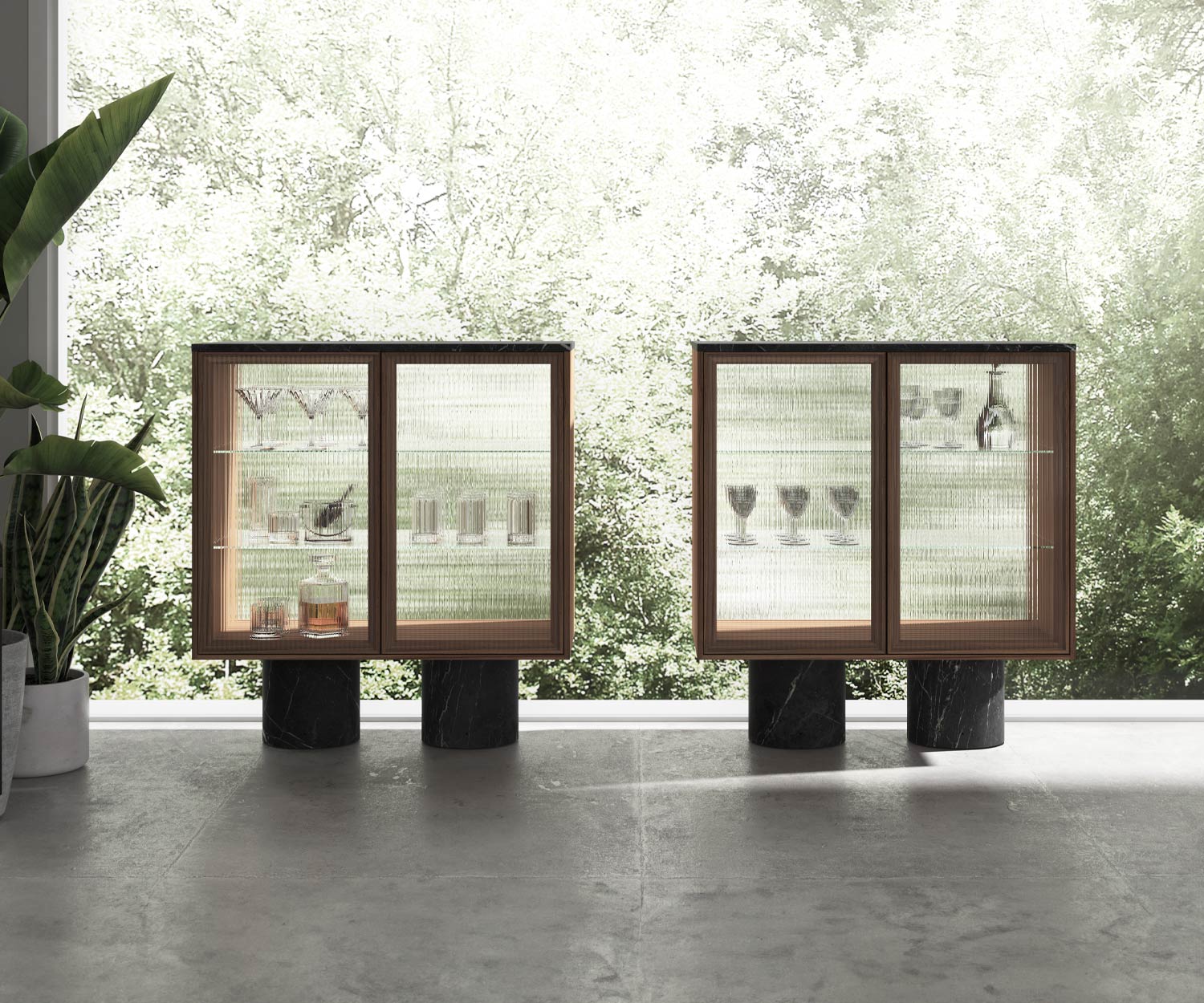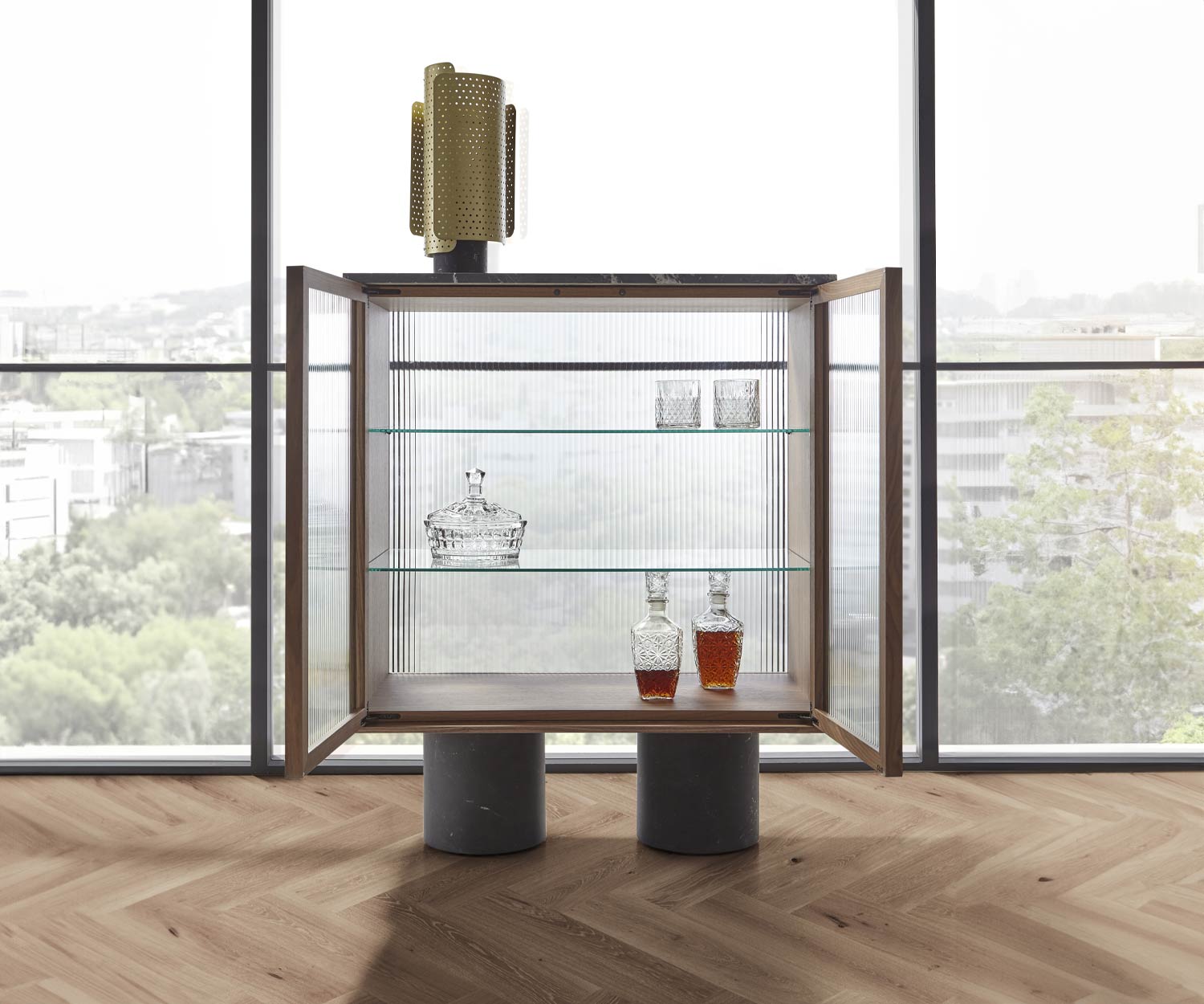 Das Punt Rio Sideboard sorgt mit seinem besonderen Design für einen Kontrast beim Betrachter. Einerseits sind da die beiden massiven Fußsäulen, die für Stabilität und Erhabenheit stehen. Andererseits stehen die Schränke über diesen für Präzision und Feinschliff. Die schlanken Holzrahmen um die Glastüren bilden so etwas wie eine Brücke zwischen den beiden schweren Säulen.