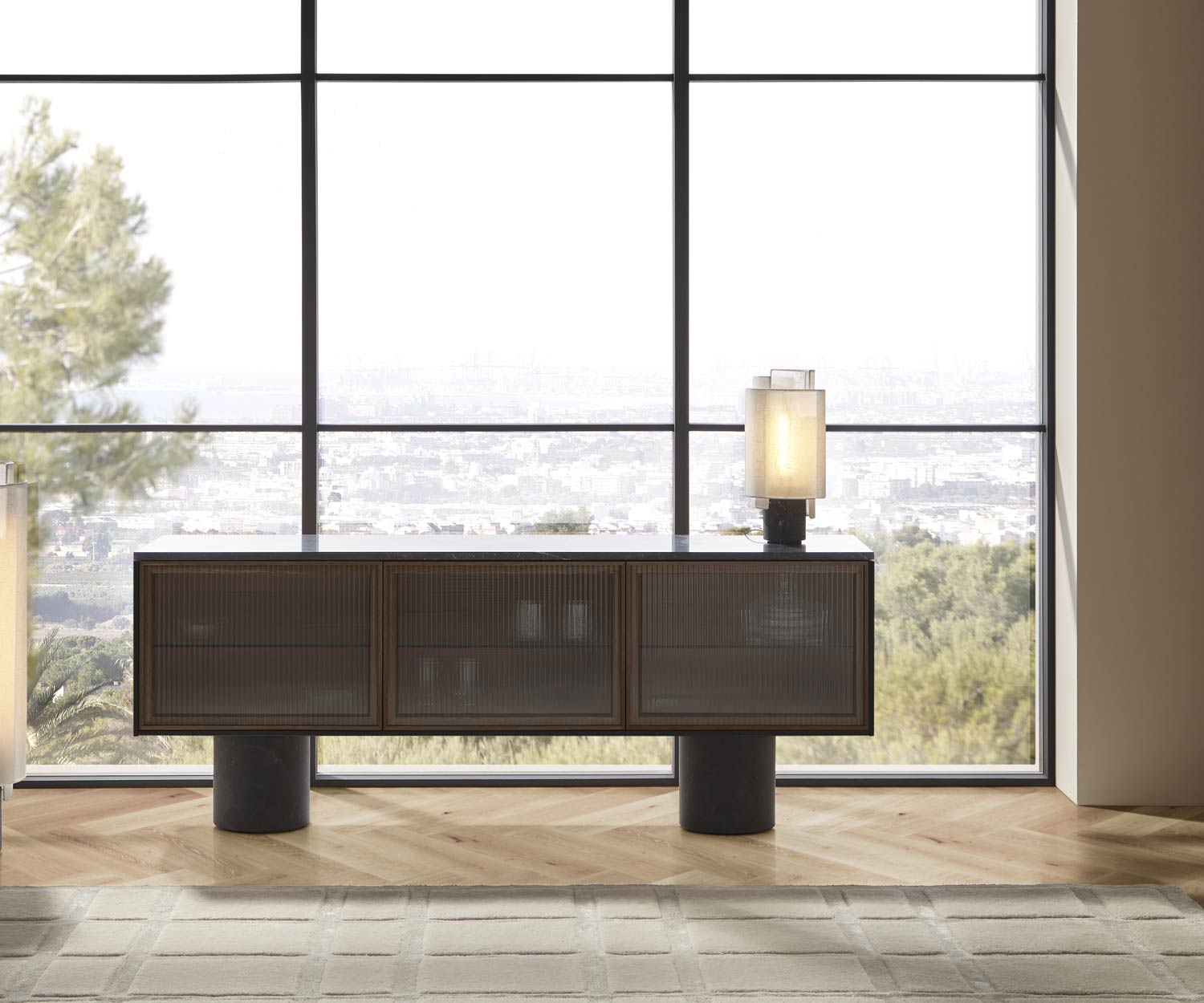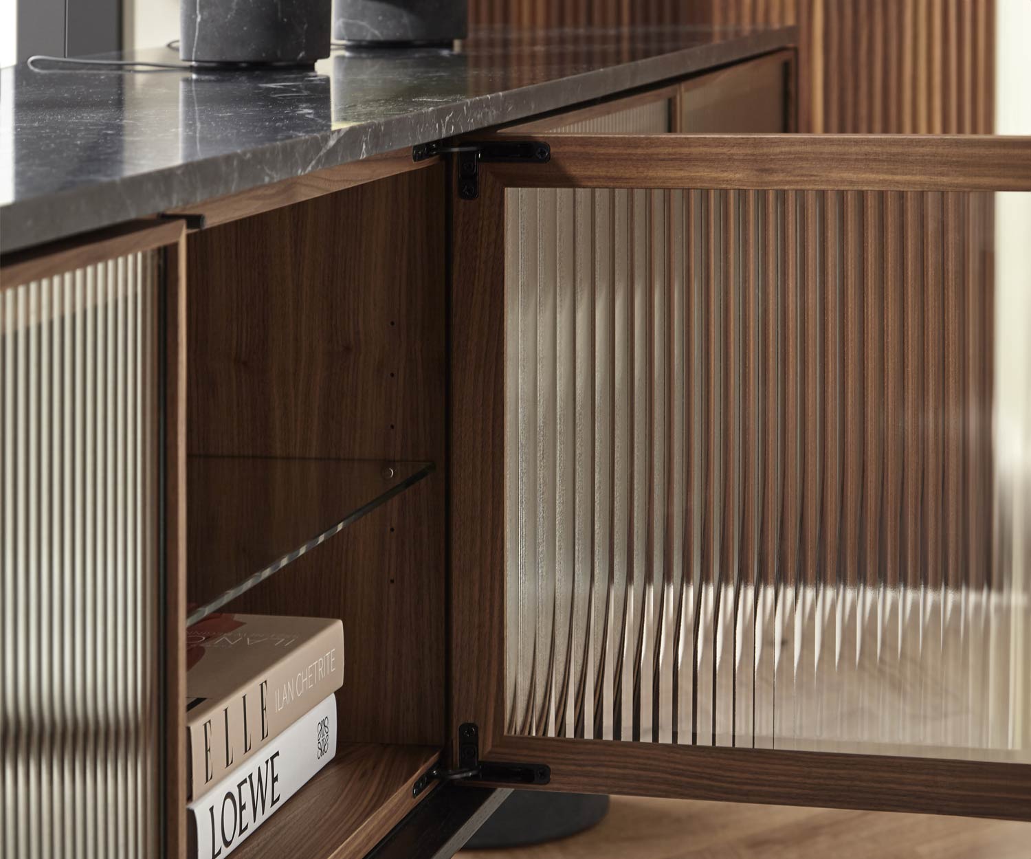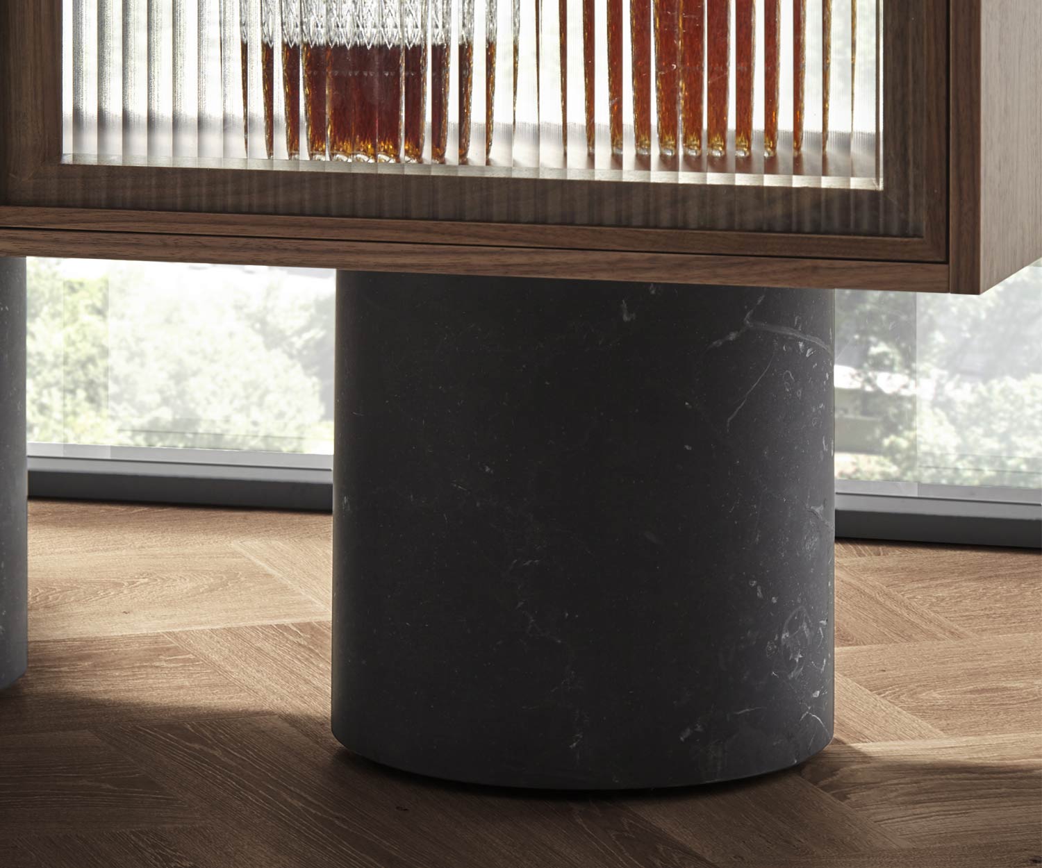 Das Herzstück des Punt Rio Designer Sideboards sind die hochwertigen MDF-Platten, die mit Walnuss Furnier veredelt sind. Abdeckplatte und Fußsäulen sind aus Marquina Marmor Matt, der Sockel dagegen aus Metall mit einer Epoxidlackierung. Die Türen sind aus gehärtetem Glas.