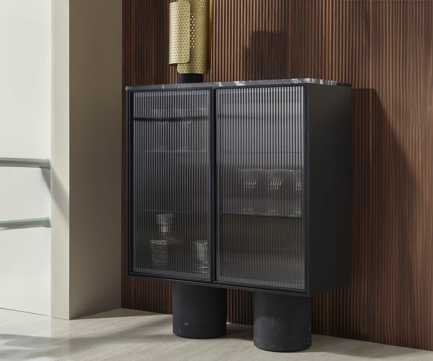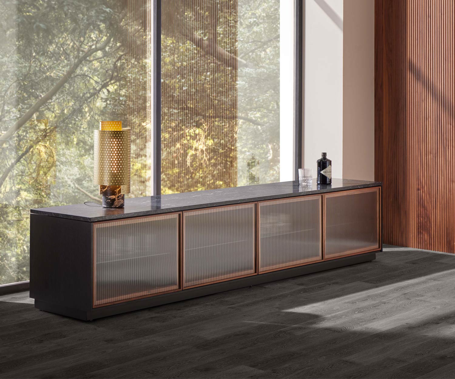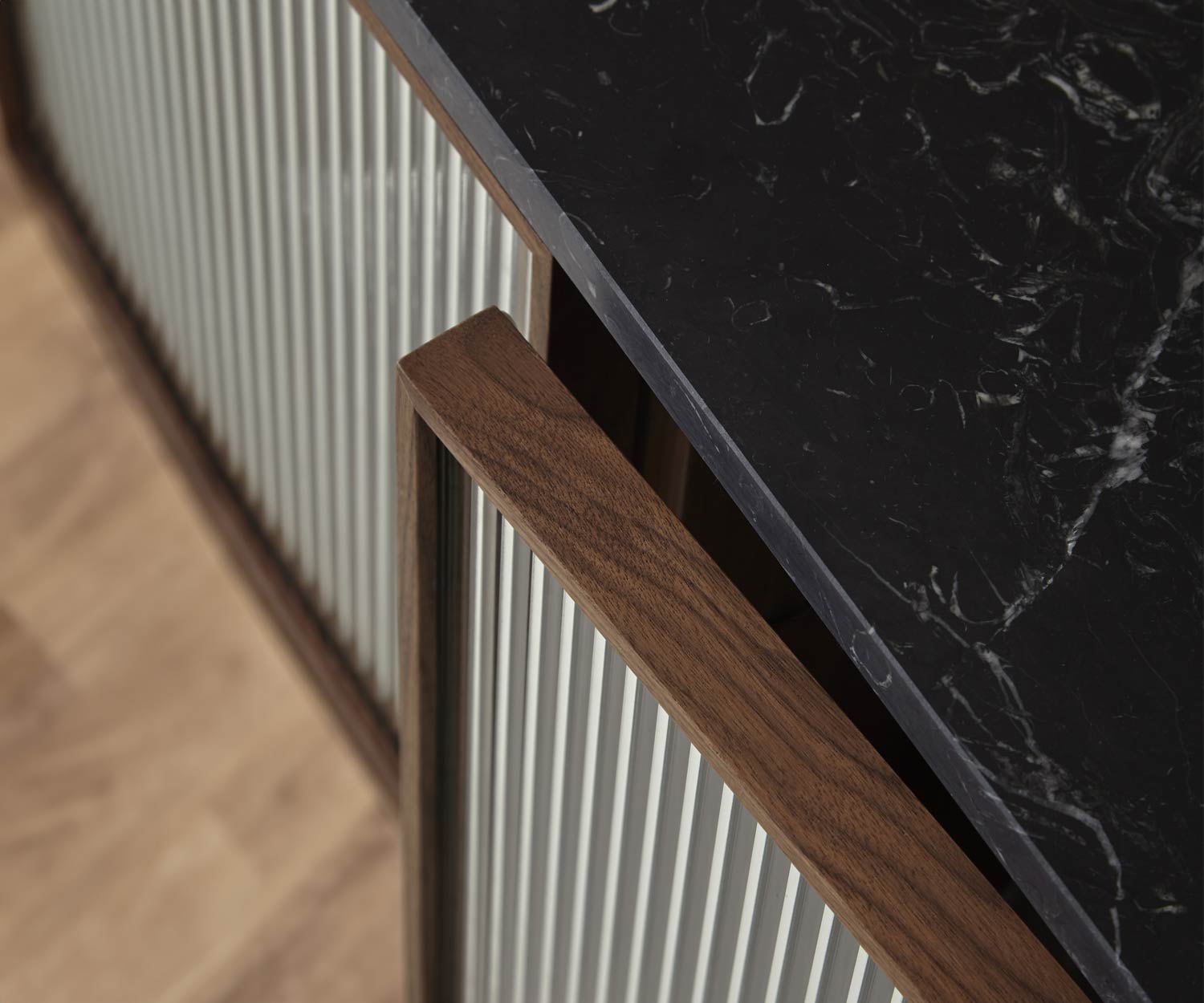 Das Herzstück des Punt Rio Designer Sideboards sind die hochwertigen MDF-Platten, die mit Walnuss Furnier veredelt sind. Abdeckplatte und Fußsäulen sind aus Marquina Marmor Matt, der Sockel dagegen aus Metall mit einer Epoxidlackierung. Die Türen sind aus gehärtetem Glas.