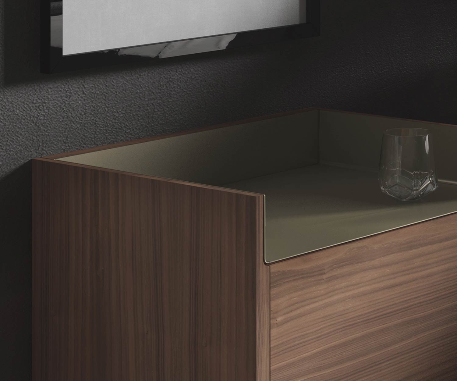 Auf seinem Top mit Aluminium Finish befindet sich eine Klappe, um Kabel von Audio/Video-Geräten dahinter zu verstecken.