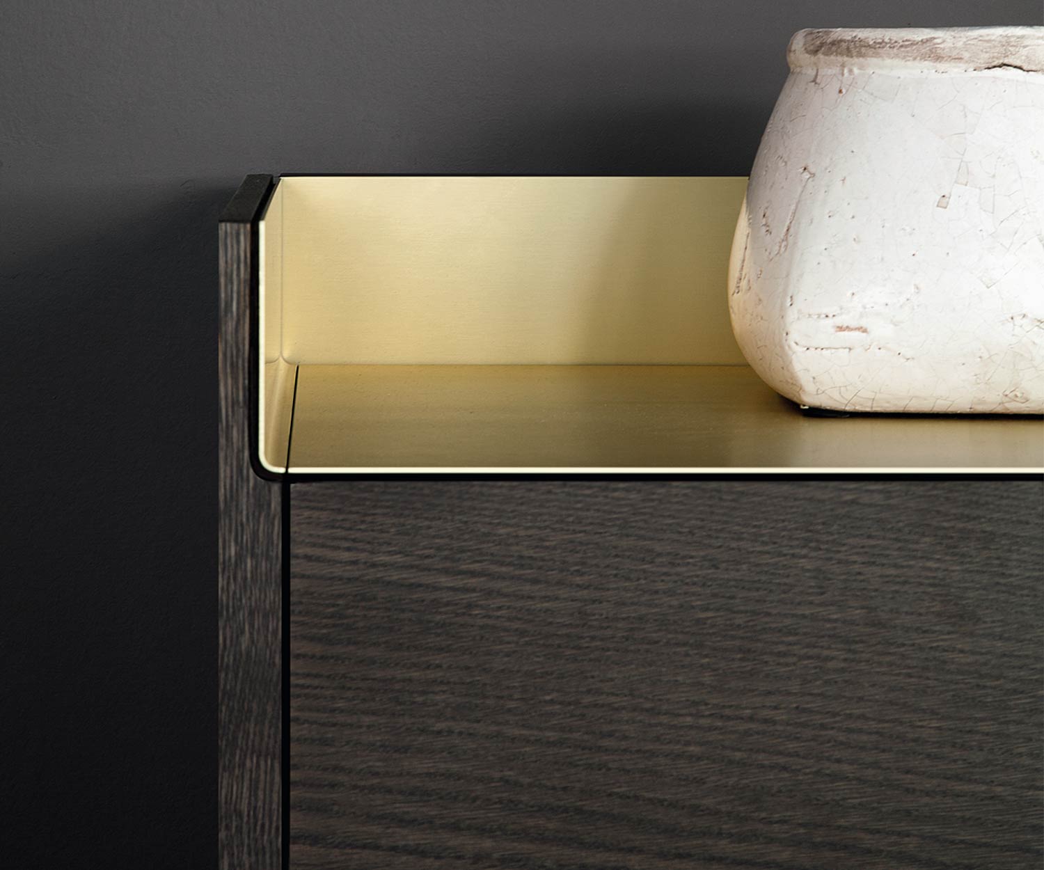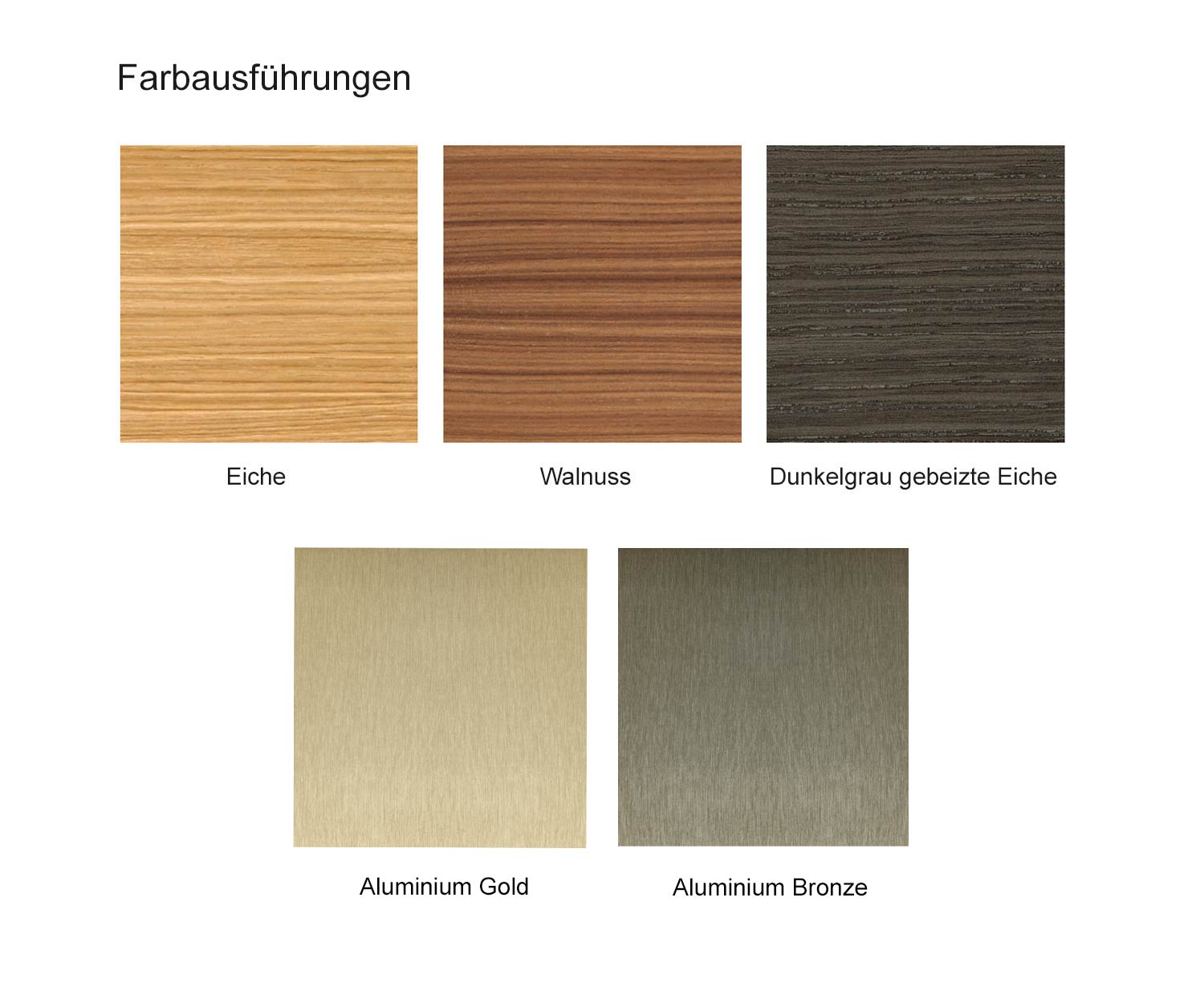 Die verwendeten Furniere gibt es in Super Matt Eiche, Super Matt Walnuss oder Dunkelgrau gebeizter Eiche (Stained Oak Dark Grey). Die Abdeckplatte ist in den Farben Aluminium Gold und Aluminium Bronze verfügbar. Die Standfüße gibt es in der RAL-Farbe 9005 Schwarz.