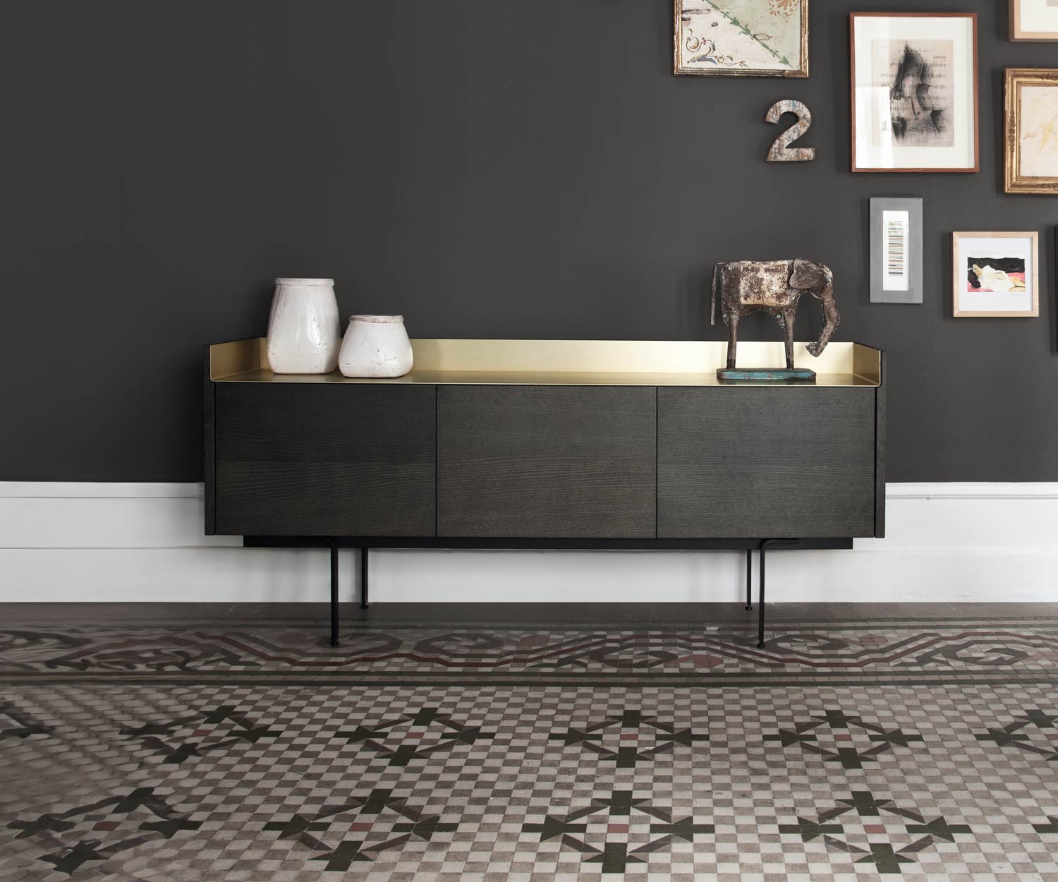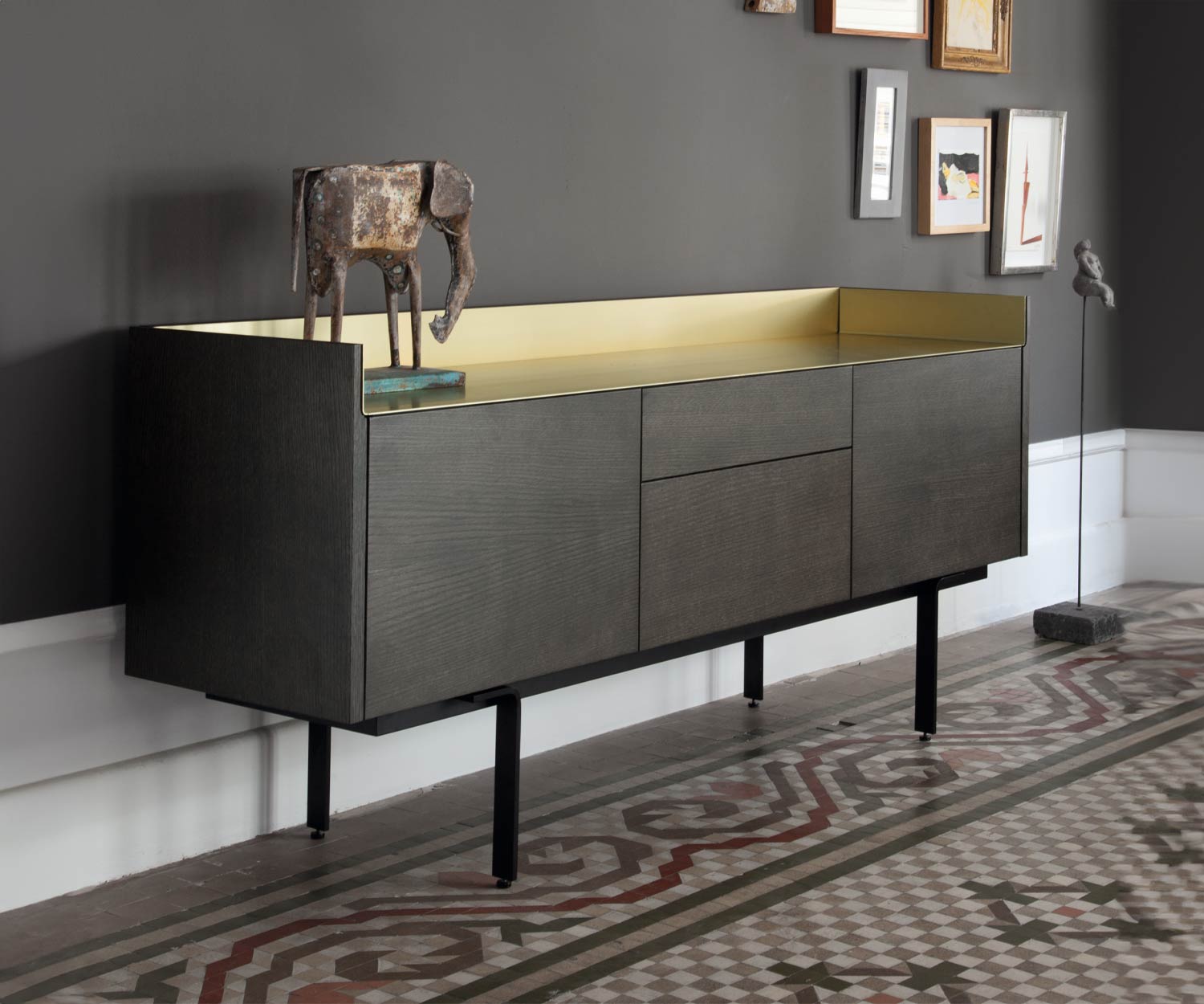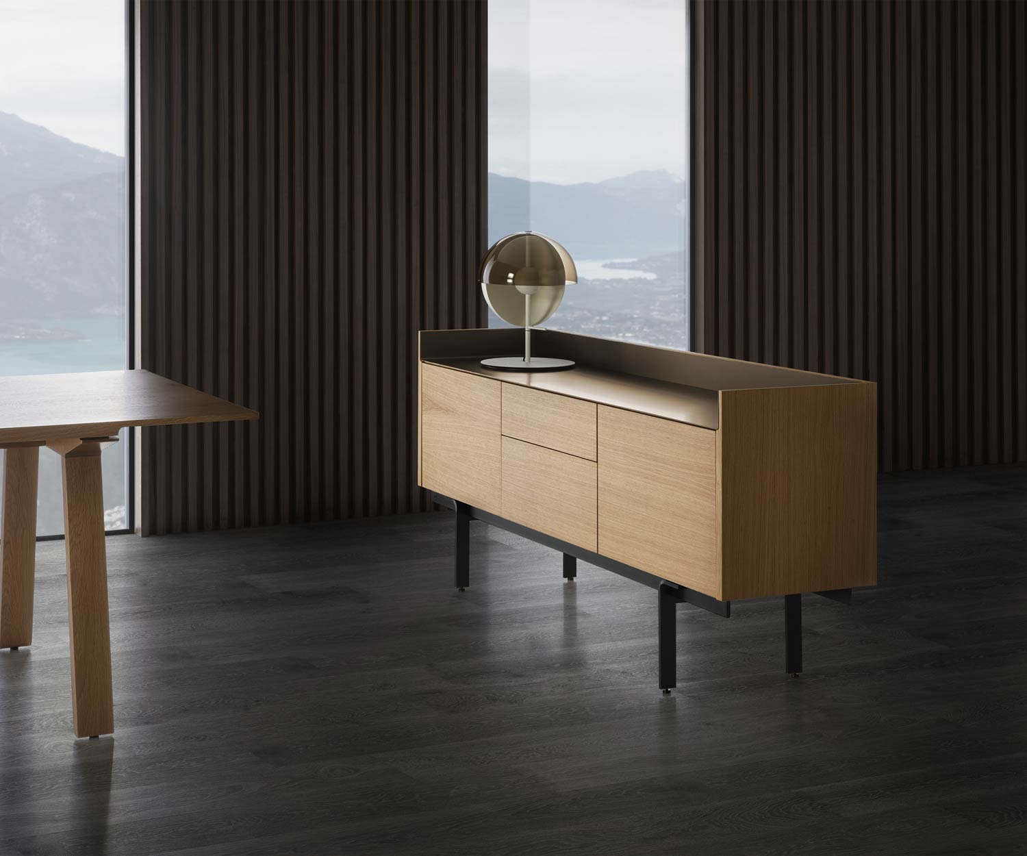 Der innere und äußere Bereich des Punt Sideboards Stockholm besteht aus MDF-Platten E1 und Spanplatten E1, die mit einem Furnier in Eiche oder Walnuss/Nussbaum veredelt und in durchlaufendem Furnierbild beschichtet sind. Die Abdeckplatte ist aus anodisiertem Aluminium. Der Korpus steht auf einem Stahlsockel mit pulverbeschichteter Oberfläche.