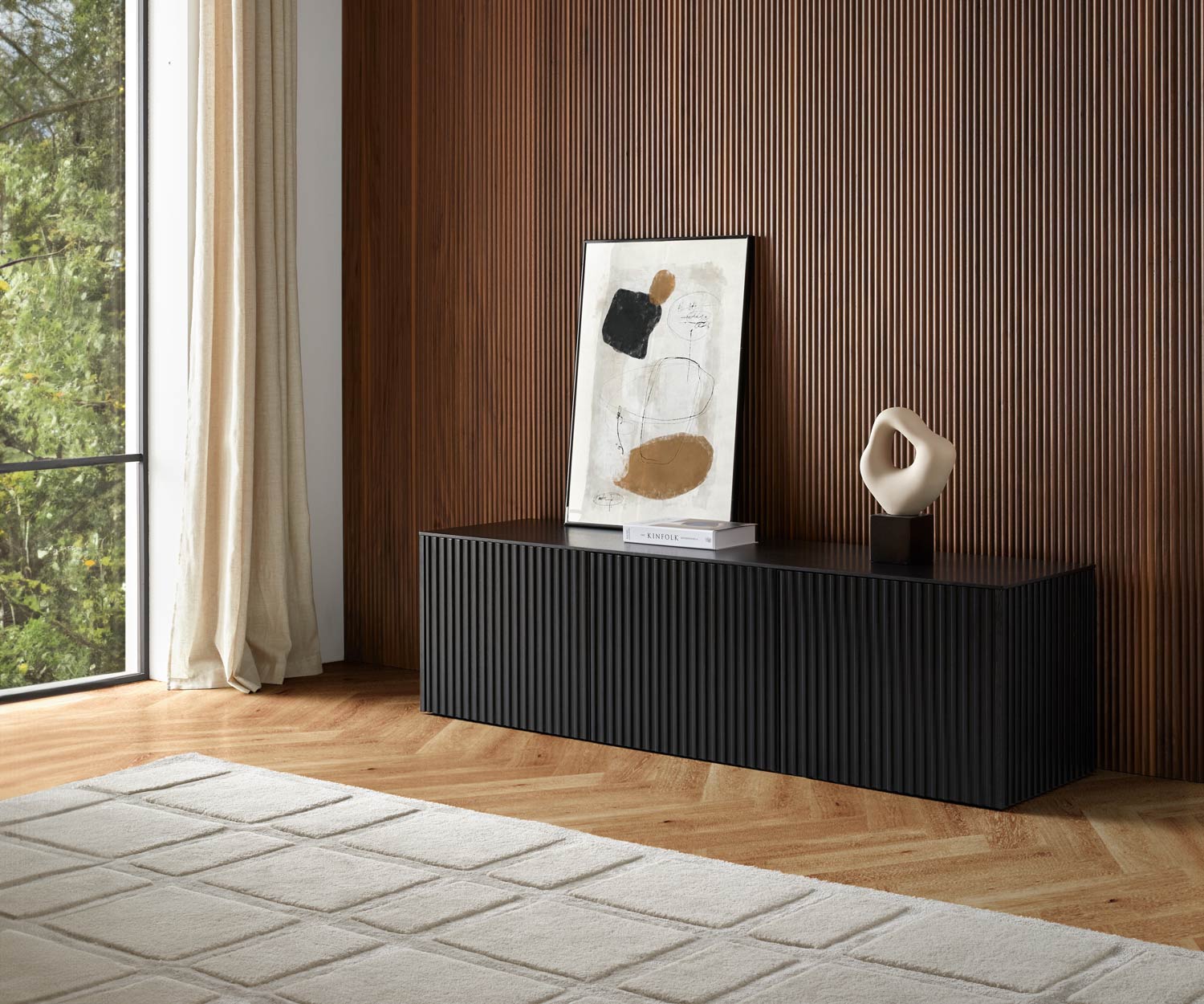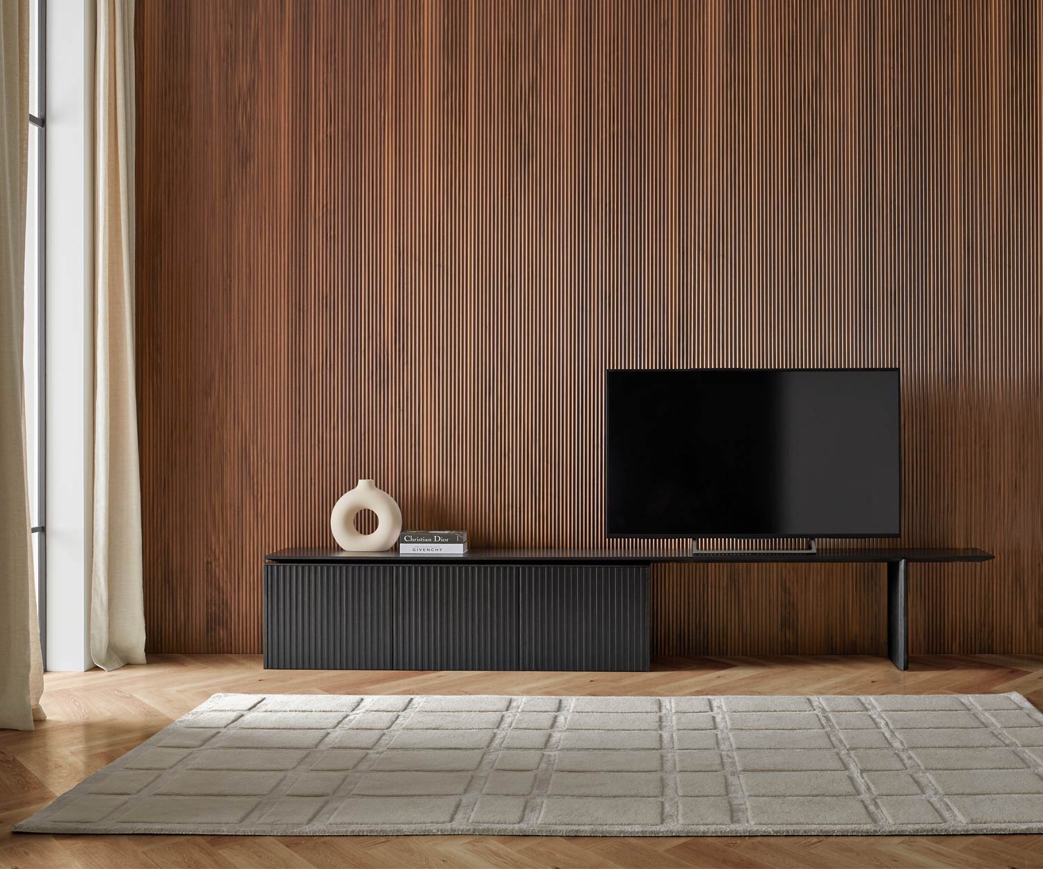 Das Punt Velasca Sideboard, entworfen von Ludovica+Roberto Palomba für Punt Mobles, ist ein architektonisches, geradliniges und minimalistisches Meisterwerk, das die Wärme des Holzes in den Vordergrund stellt. Seine Türen zeichnen sich durch ein vertikales Muster aus, das dem Möbelstück eine beeindruckende Dreidimensionalität verleiht. Dieses Sideboard vereint gekonnt geometrische Strenge mit der Lebendigkeit der Holzmaserung, wodurch ein zartes Gleichgewicht entsteht, das fast skulptural wirkt.