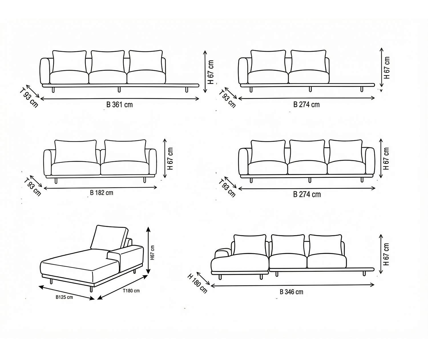 B 182 cm / H 67 cm / T 93 cm (2-Sitzer)